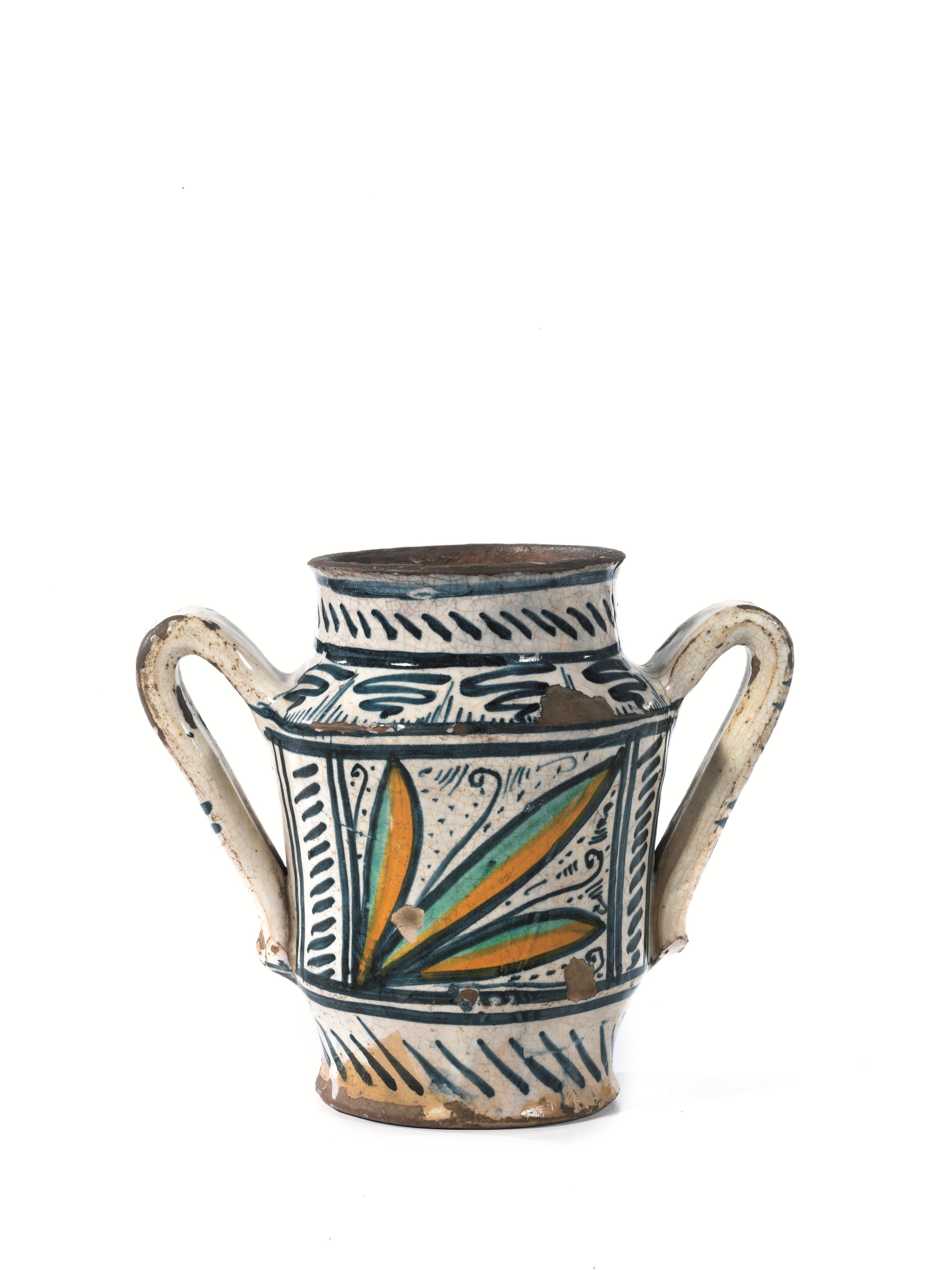 Vaso biansato, Deruta, sec. XV, in maiolica decorata in blu a motivo di foglie stilizzate in giallo e verde vegetali, due anse a nastro, alt. cm 16
