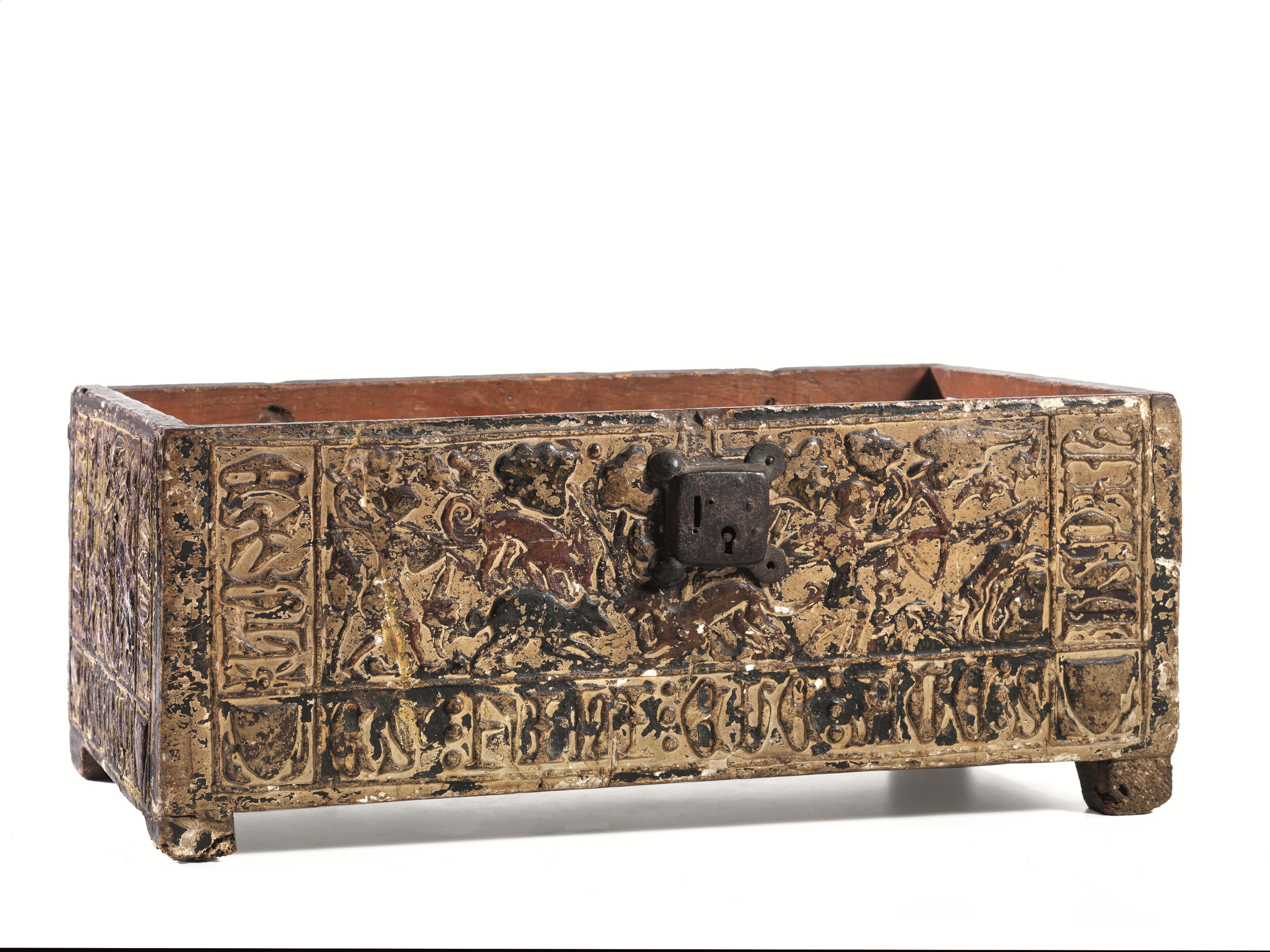 Scatola, sec. XV, in pastiglia dipinta con scene di caccia e di genere con iscrizioni, cm 42x26x18, priva del coperchio, mancanze alla policromia