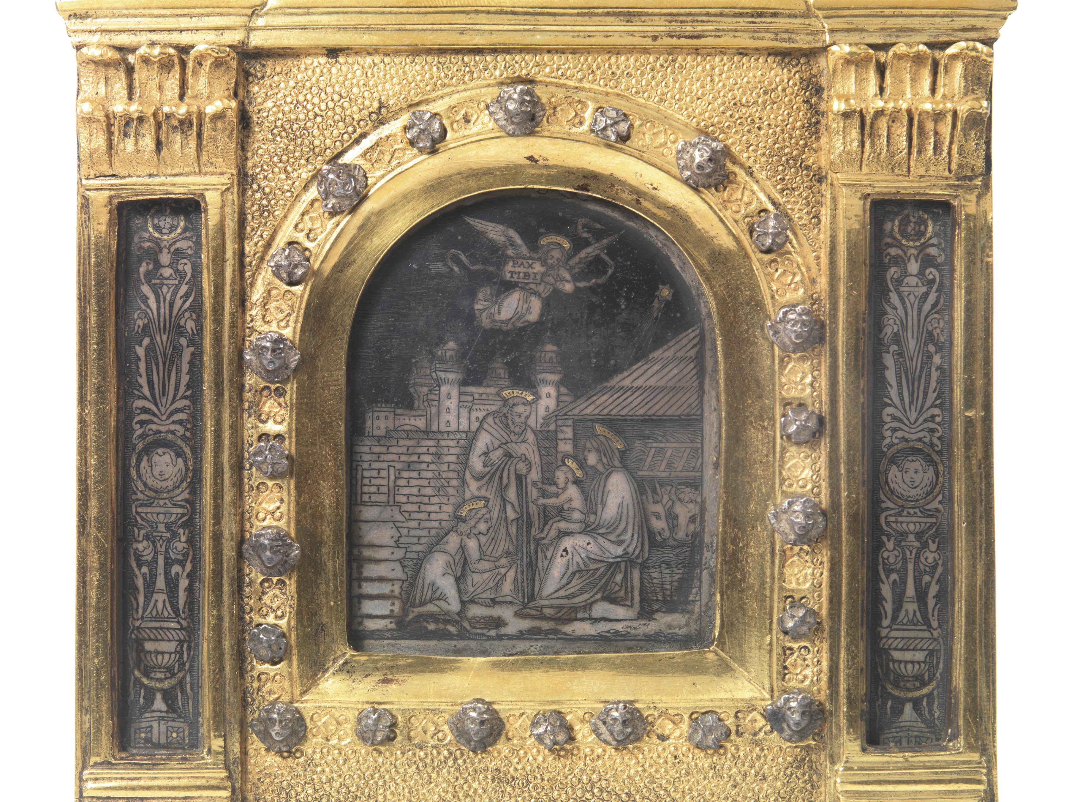 Pace, scuola orafa del centro Italia, fine sec. XV-inizi sec. XVI, in bronzo e argento, finemente cesellata e arricchita di smalti e niello, raffigurante Natività, cm 22,5x13,3, alcuni elementi di epoca successiva