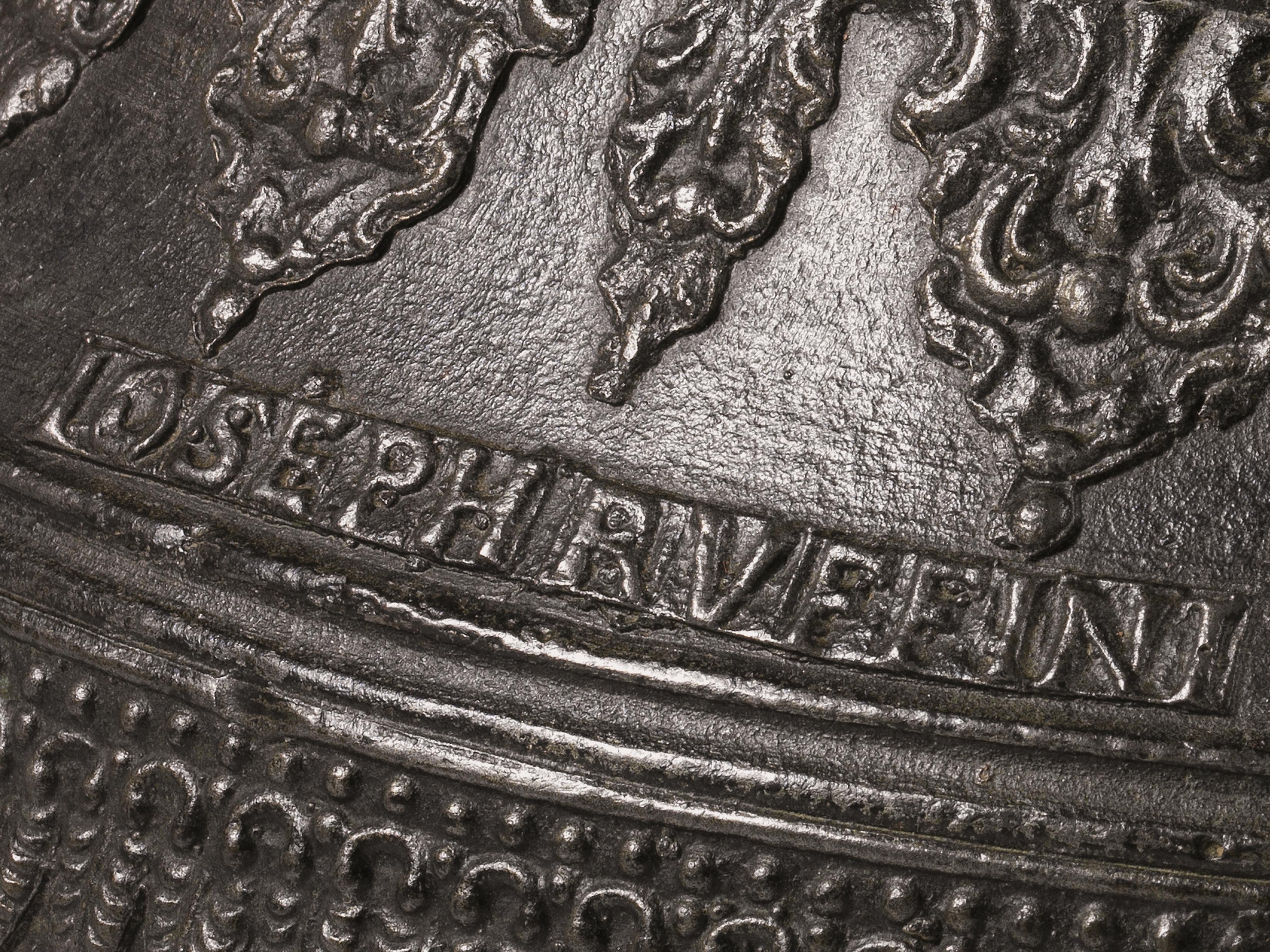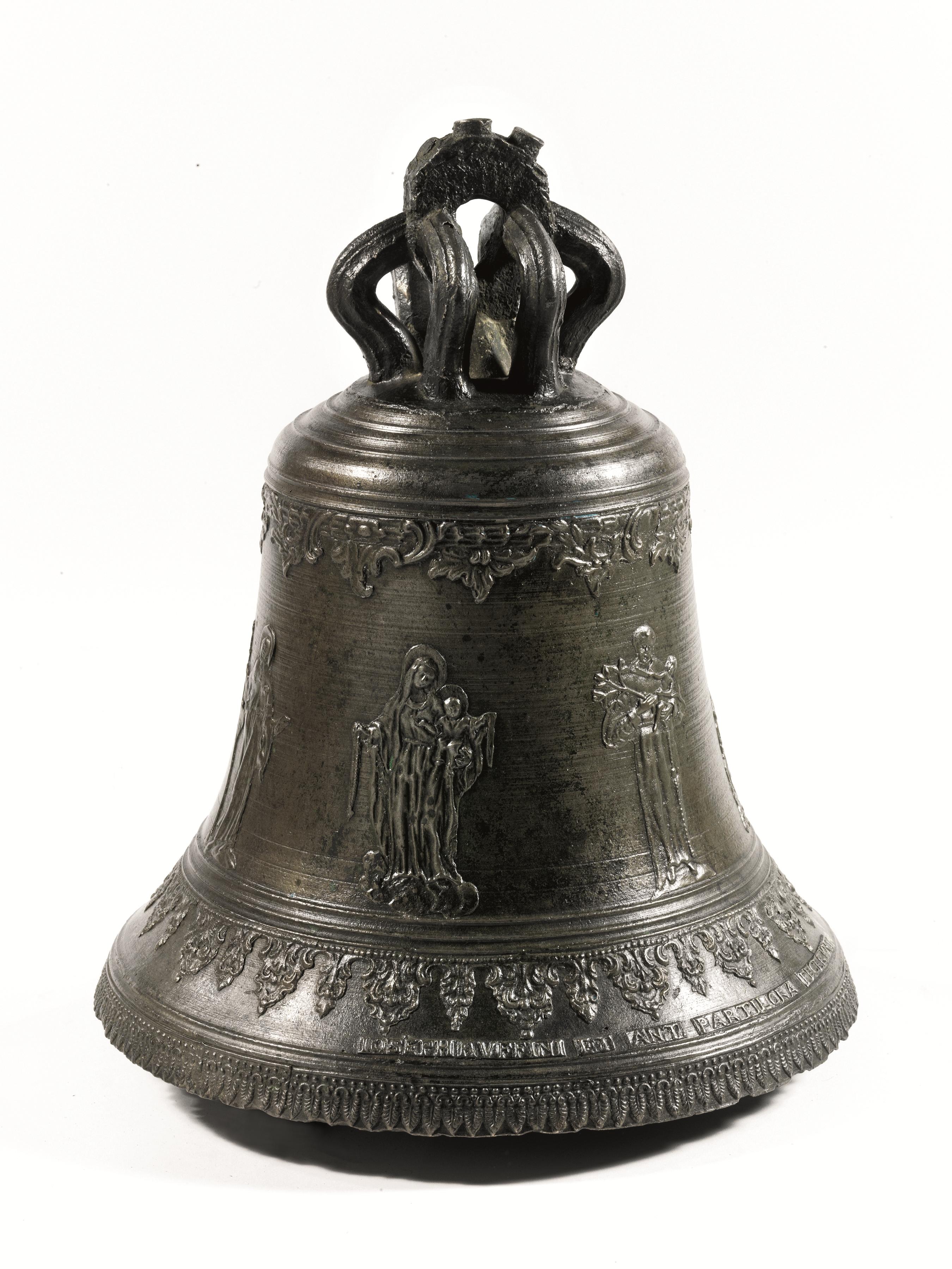Campana, Veneto, 1796, in bronzo fuso ornato da un partito decorativo raffigurante San Giacomo, Sant'Antonio da Padova, San Rocco, la Vergine del Rosario, il battesimo di San Giovanni Battista e la Crocifissione, datata e firmata Giuseppe Ruffini e Anton Maria Partilora, alt. cm 45, diam. bocca cm 38,5