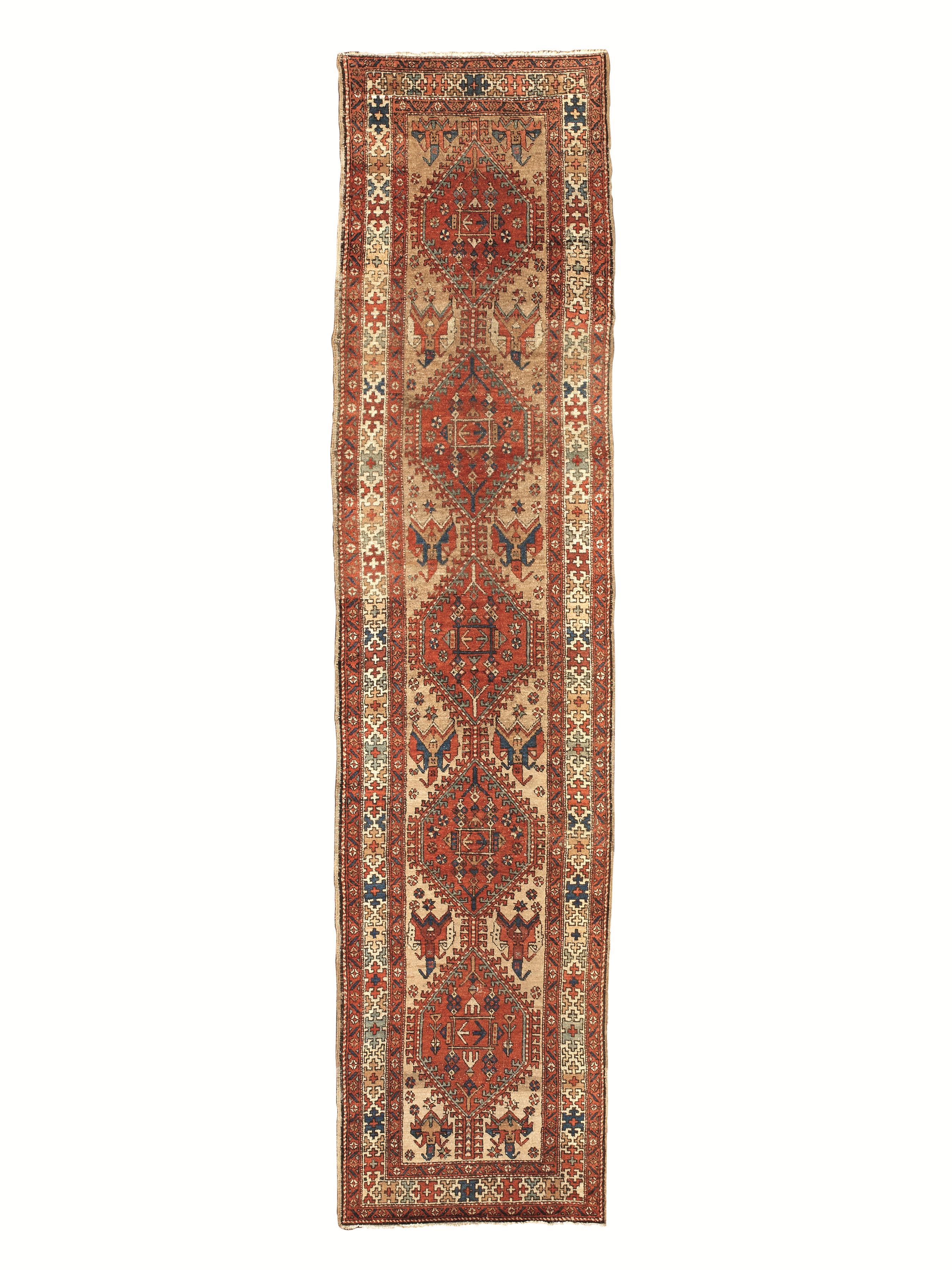 Galleria persiana Sarab, sec. XIX, fondo avorio con medaglioni romboidali rossi, bordura avorio con decori geometrici nei toni del verde e del rosso, cm 430x98