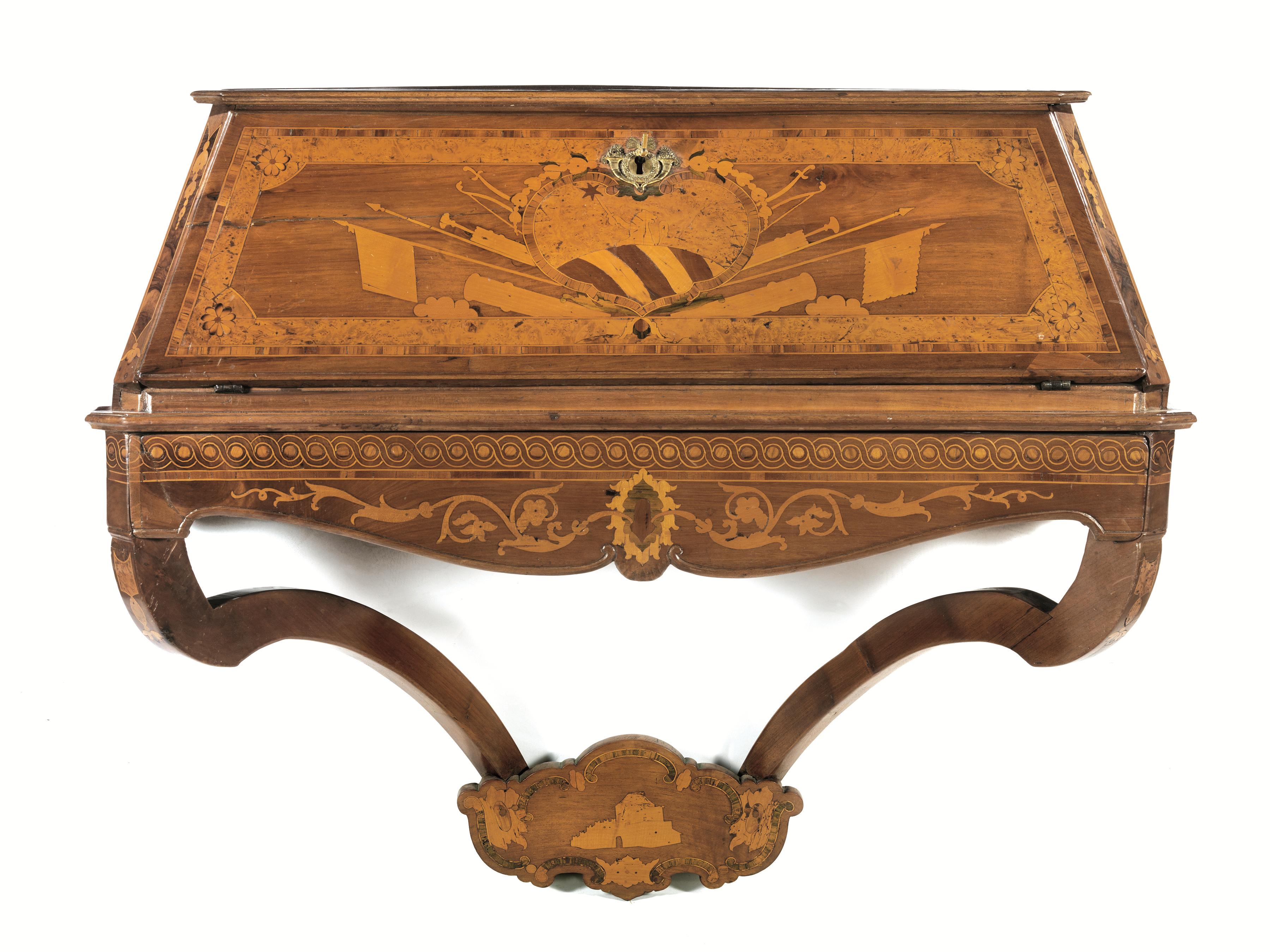 Scrivania pensile, Emilia, fine sec. XVIII, in noce intarsiato in radica di noce ed altre essenze, piano rettangolare con angoli scantonati, sportello a ribalta decorato sul fronte da stemma gentilizio su trofeo d'armi, scarabattolo interno con quattro cassetti e sportello, pendaglina sagomata frontale e laterale che nasconde un ulteriore cassetto, sostegni a voluta riuniti da grande cartiglio intarsiato con castello entro riserva sagomata, cm 105x51x95, alcuni danni e restauri