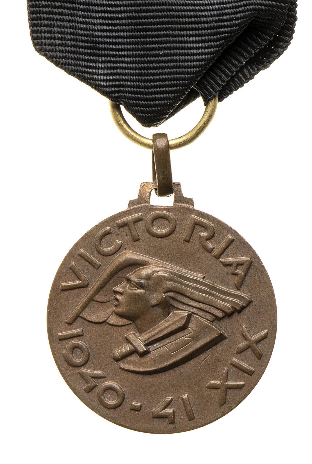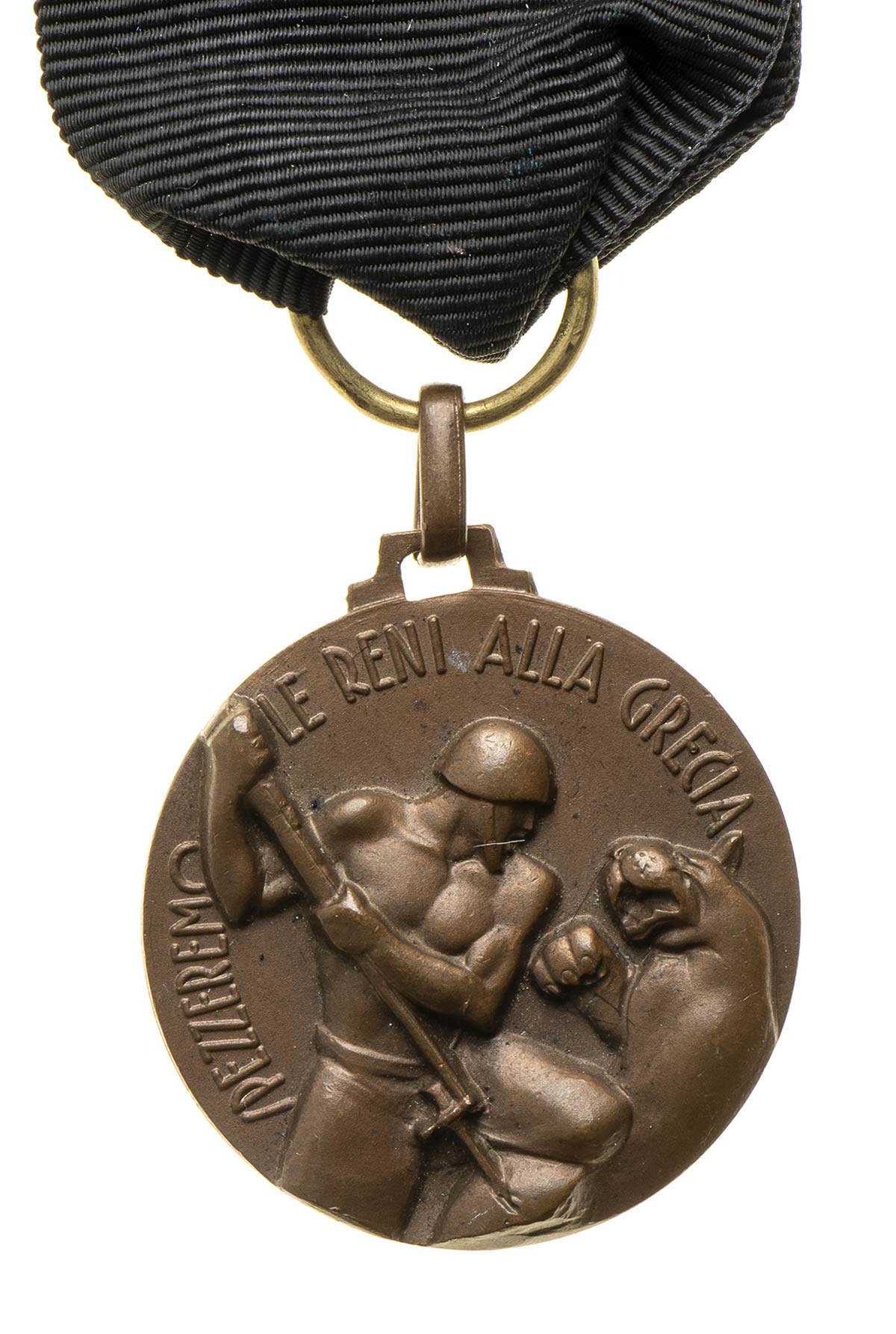 MEDAGLIA CONIATA IN BRONZO, FANTE CHE UCCIDE LEONESSA CON MOTTO “SPEZZEREMO LE RENI ALLAGREECE”, AL VERSO TESTA DI VITTORIA ALATA E DATE DELLA CAMPAGNA, 1940-41. FIOR DI CONIO CON NASTRO NERO