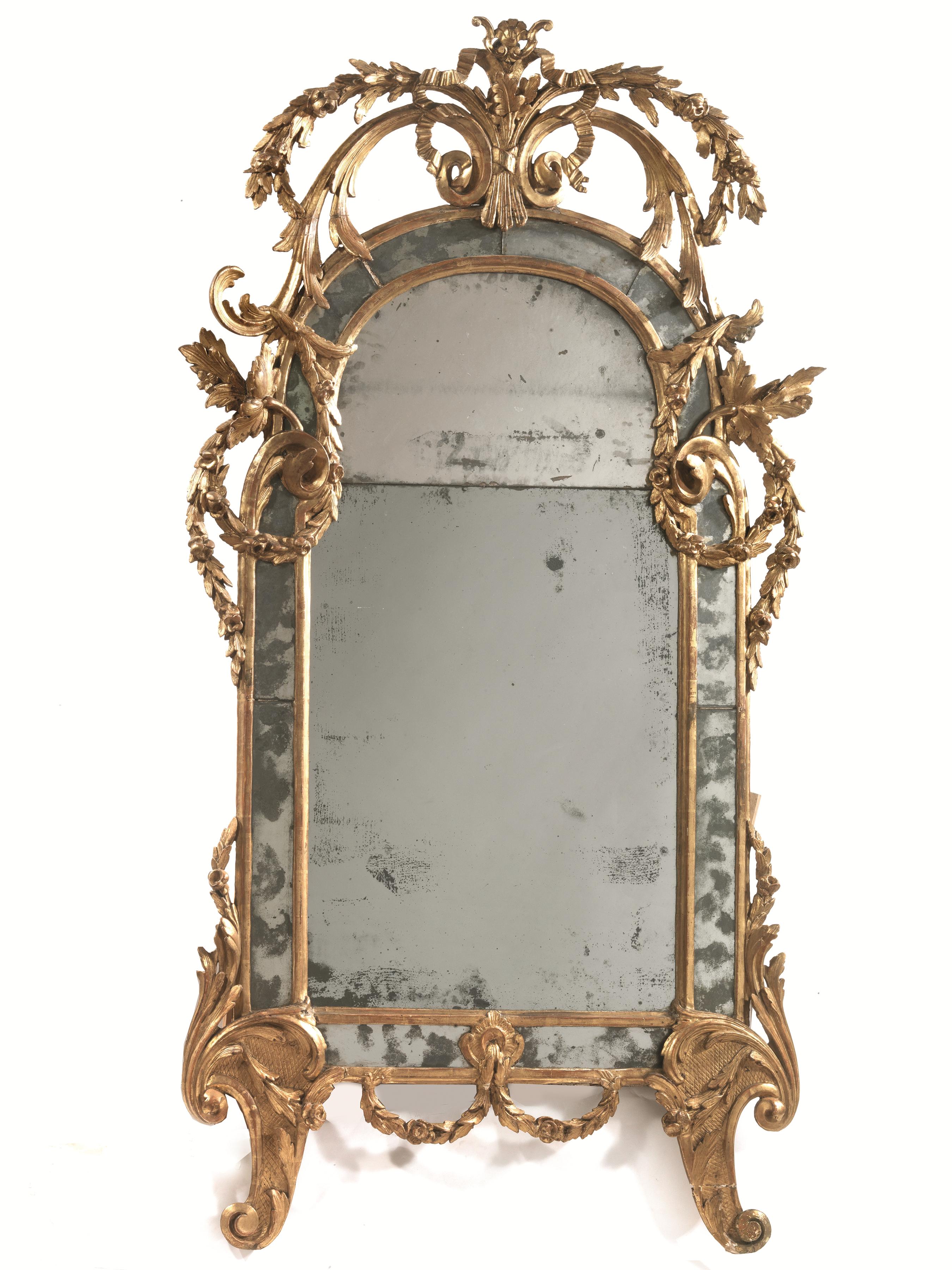 Grande specchiera, Italia centrale, metà sec. XVIII, in legno intagliato e dorato, sormontato da alta cimasa a volute e tralci fitomorfi che ricadono lungo i fianchi, cornice centinata, piedi a ricciolo, festoni pendenti nella parte inferiore, cm 207x112
