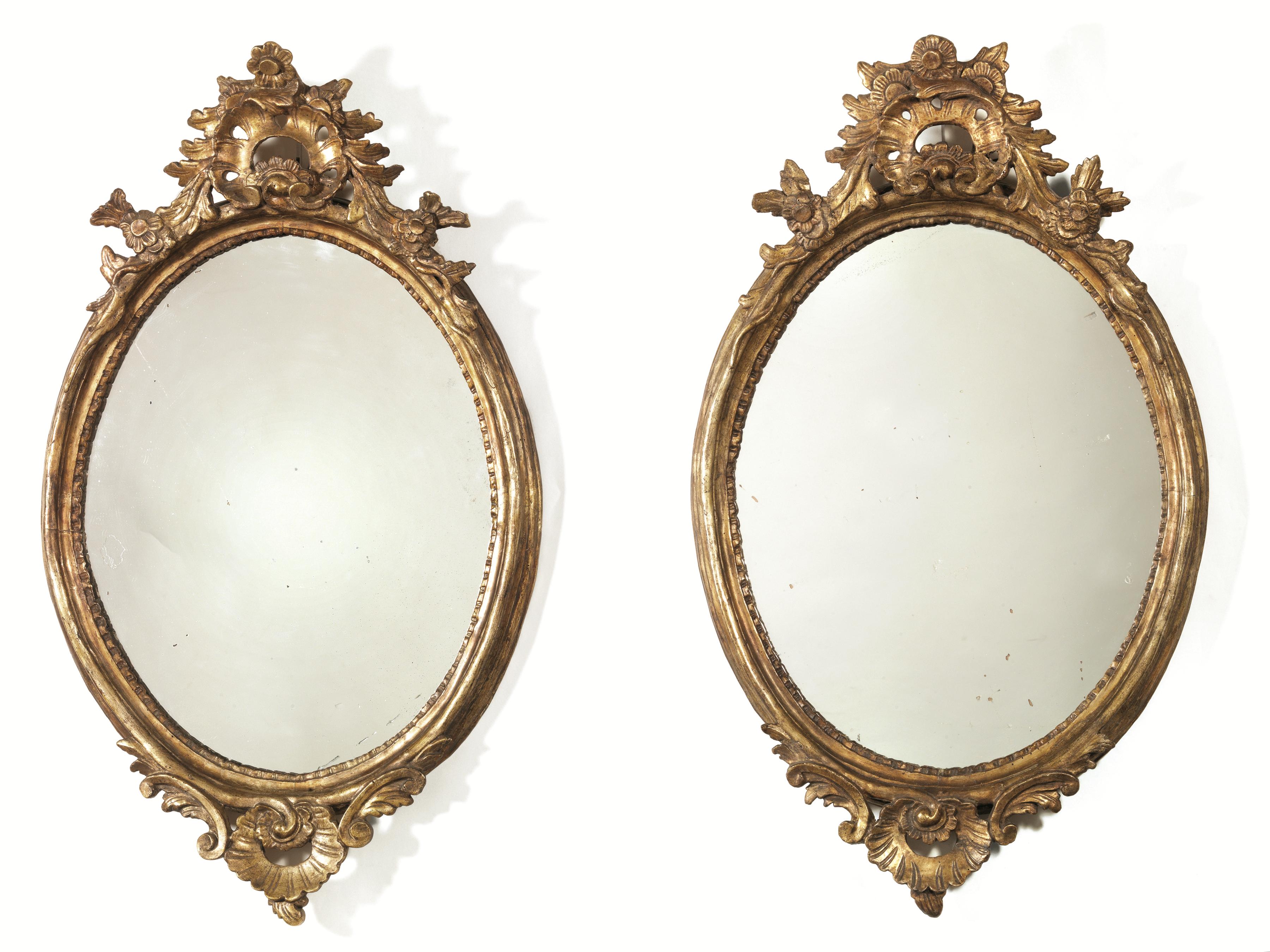 Coppia di cornici ovali, Toscana, seconda metà sec. XVIII, in legno intagliato e dorato a mecca, cimasa centrata da conchiglia di gusto rocaille con fiori e foglie ricadenti, bordo interno a piccole foglie stilizzate, cm 96x57, alcuni danni e restauri