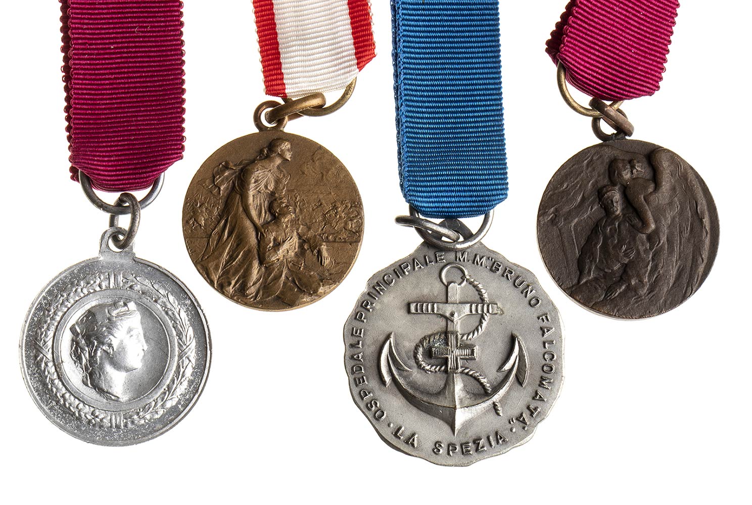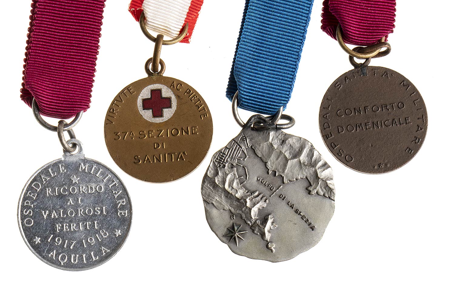 UNA MEDAGLIA IN ARGENTO DELL'OSPEDALE DI LA SPEZIA EPOCA RI, UNA IN ALLUMINIO AI VALOROSI FERITI 1917 OSPEDALE DELL'AQUILA, UNA IN BRONZO 37° SEZ. SANITA' GRANDE GUERRA, UNA CONFORTO DOMENICALE OSPEDALI SANITA' MILITARE