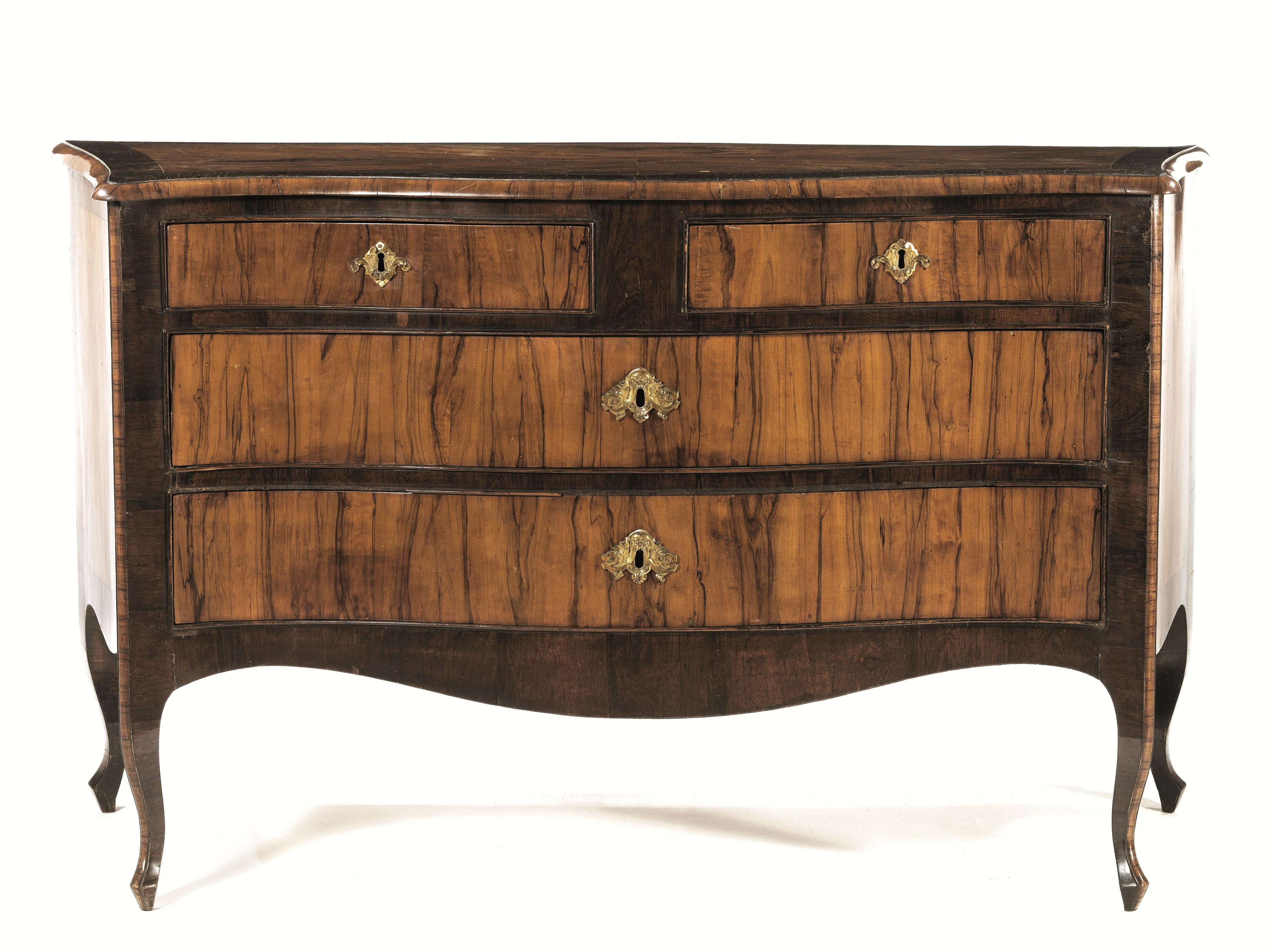 Cassettone a balestra, Firenze, ultimo quarto sec. XVIII, palissandro e radica di olivo, piano sagomato con becco di civetta, fronte e fianchi mossi, due cassetti appaiati nella fascia e due sottostanti, pendaglina sagomata frontale e laterale, gambe sinuose su piedi a zoccolo stilizzato, cm 124x57x89, alcune mancanze