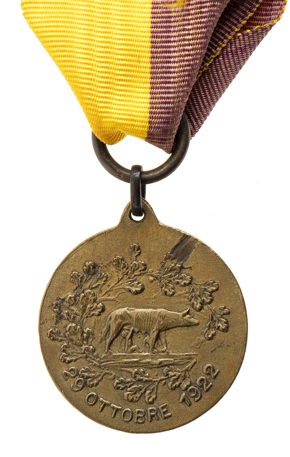 CURIOSA VARIANTE DELLA MEDAGLIA COMMEMORATIVA LA MARCIA SU ROMA, FASCIO REPUBBLICANO AL FRONTE, AL VERSO LUPA CAPITOLINA TRA FRONDE DI QUERCIA E DATA 22 OTTOBRE 1922, INTERESSANTE