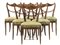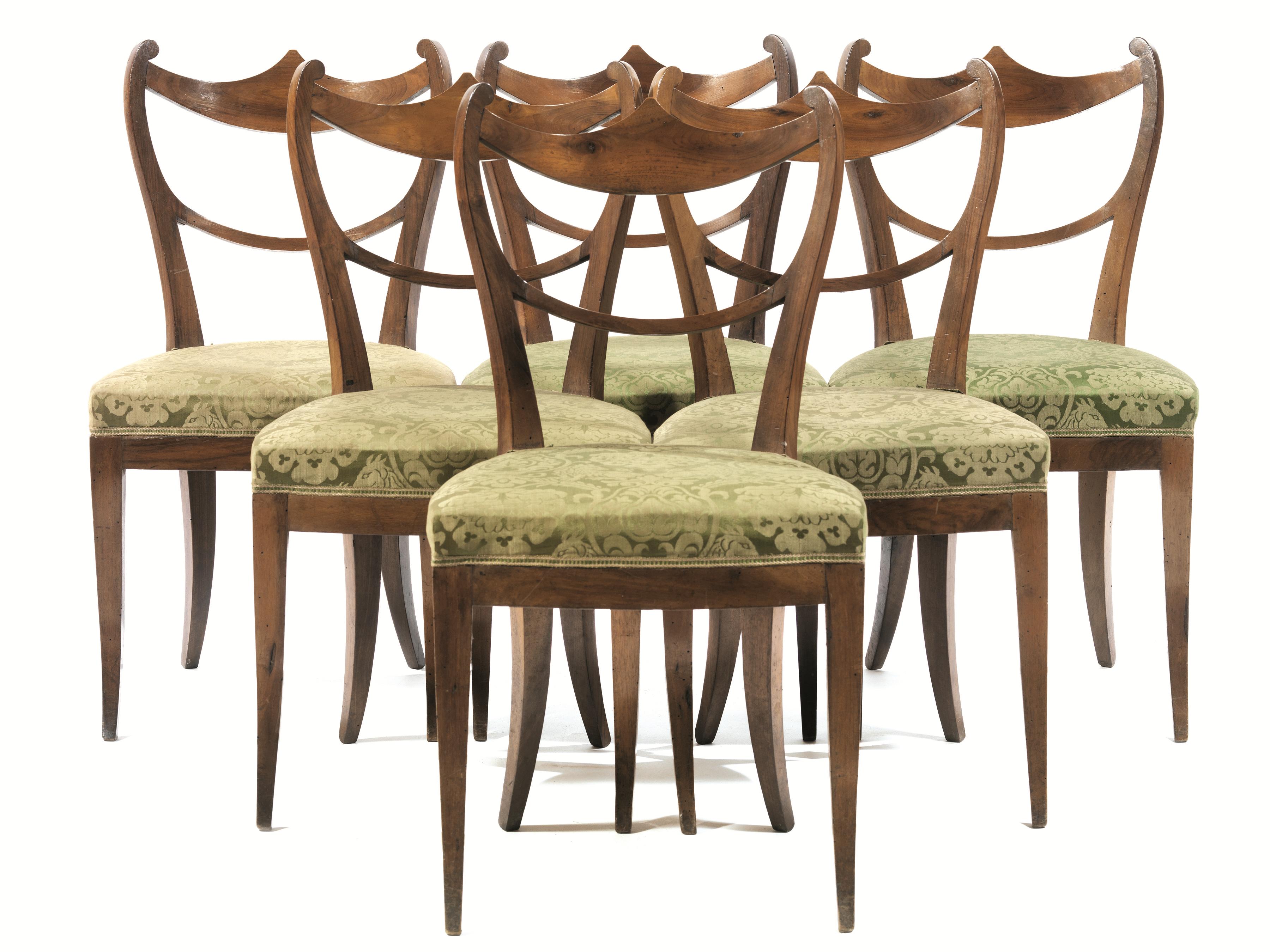 Sei sedie, Toscana, fine sec. XVIII, in noce, spalliera a lira stilizzata con cartella sagomata, gambe a sciabola, sedili ricoperti in damasco verde, piccoli danni (6)