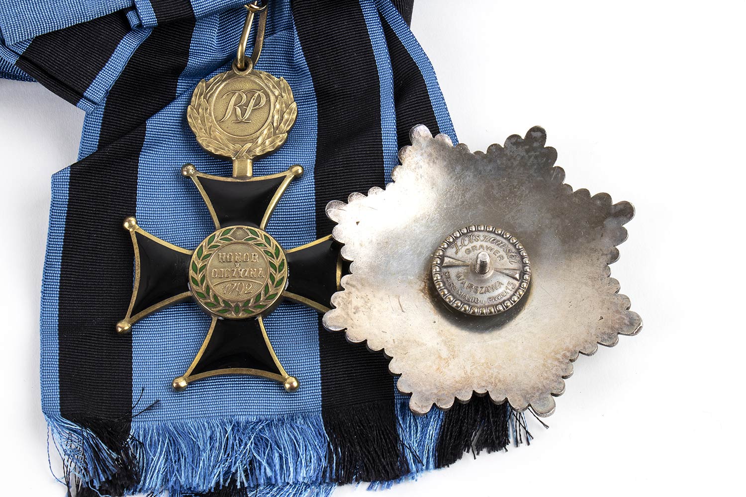 BELL’INSEGNA DI GRAN CROCE DI FATTURA POST BELLICA MA DI GRANDE QUALITA’. PLACCA IN BRONZO O RAME ARGENTATO CARICATA DI CROCE IN SMALTO NERO, AL VERSO VITE CON PLACCA MARCATA DEL FABBRICANTE ZOLSZEWSKI VARSAVIA, PENDENTE CON SIGLA RP SU CROCE IN SMALTO NERO E VERDE, NASTRO NON COEVO. ANNI 50 CIRCA