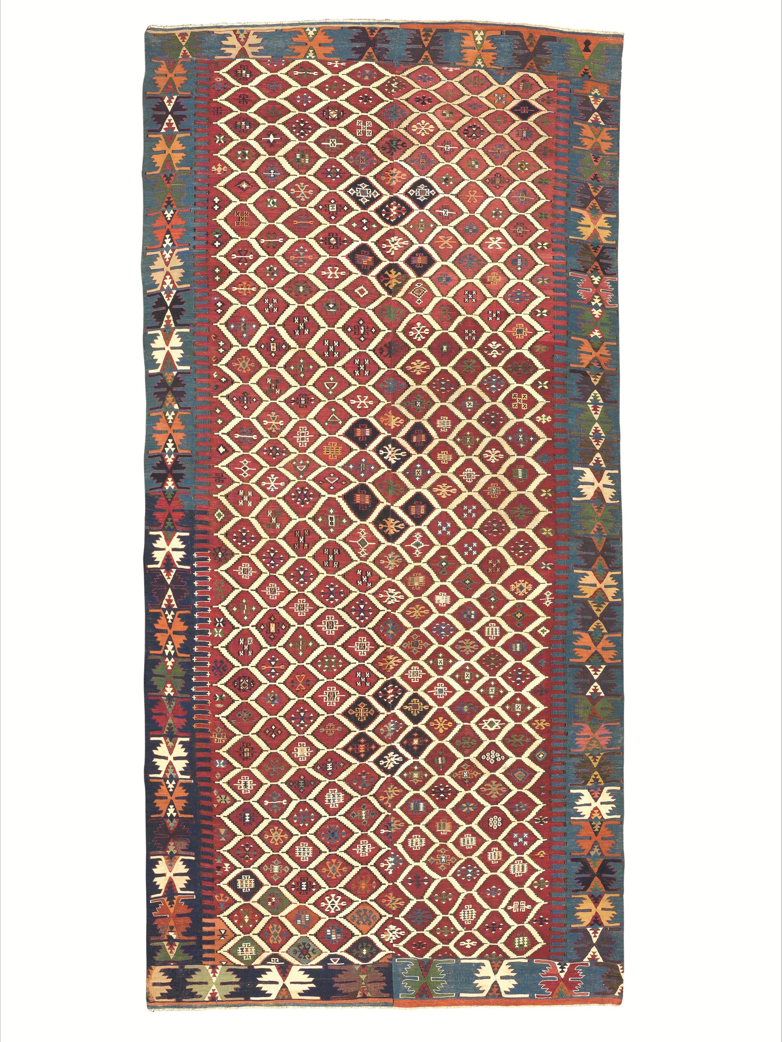Tappeto Kilim Anatolico, metà sec. XIX, fondo bianco cosparso da decori a rombi in rosso e verde, ampia bordura azzurra con foglie stilizzate verdi, rosse e bianche, cm 375x180