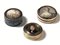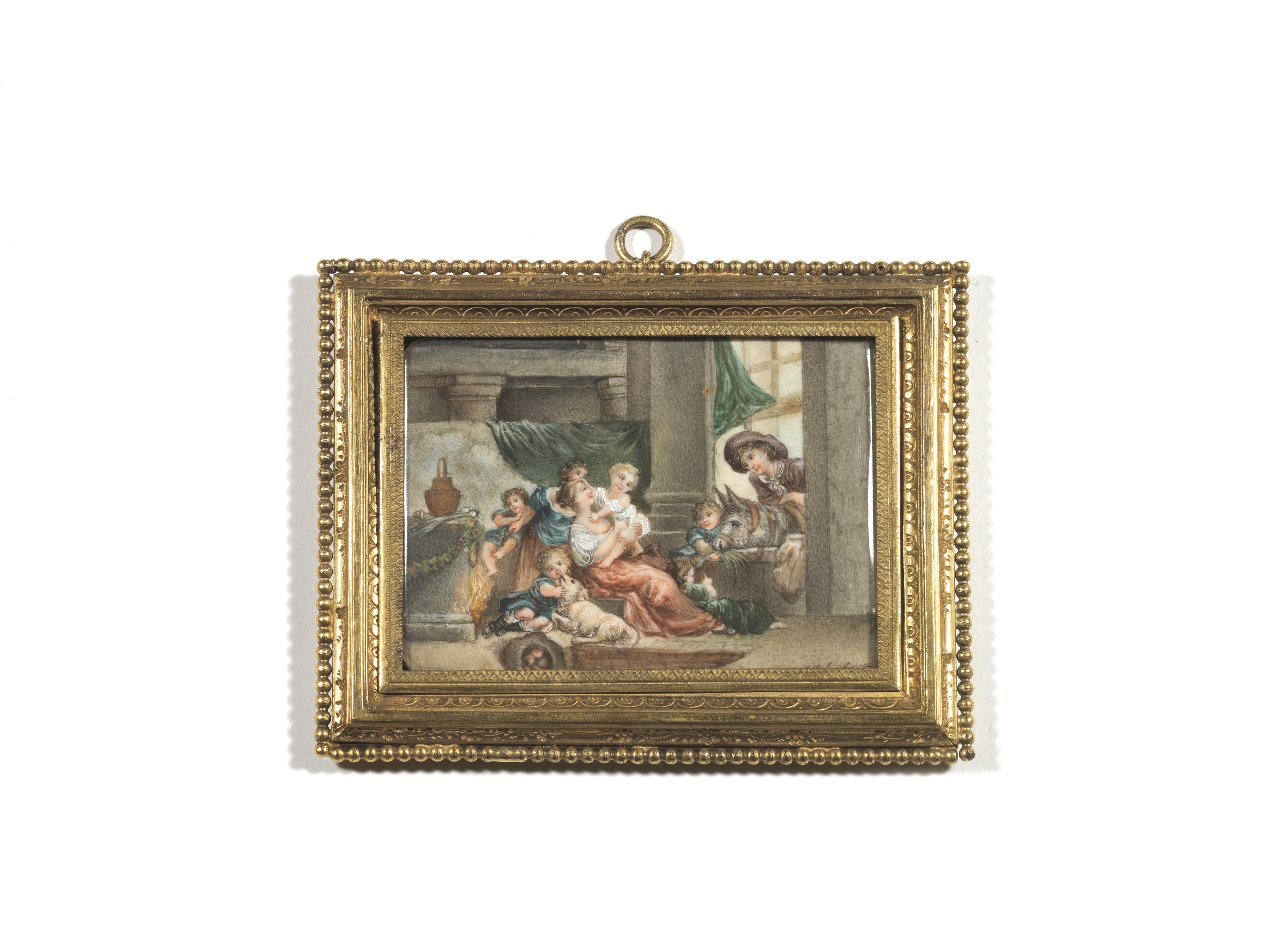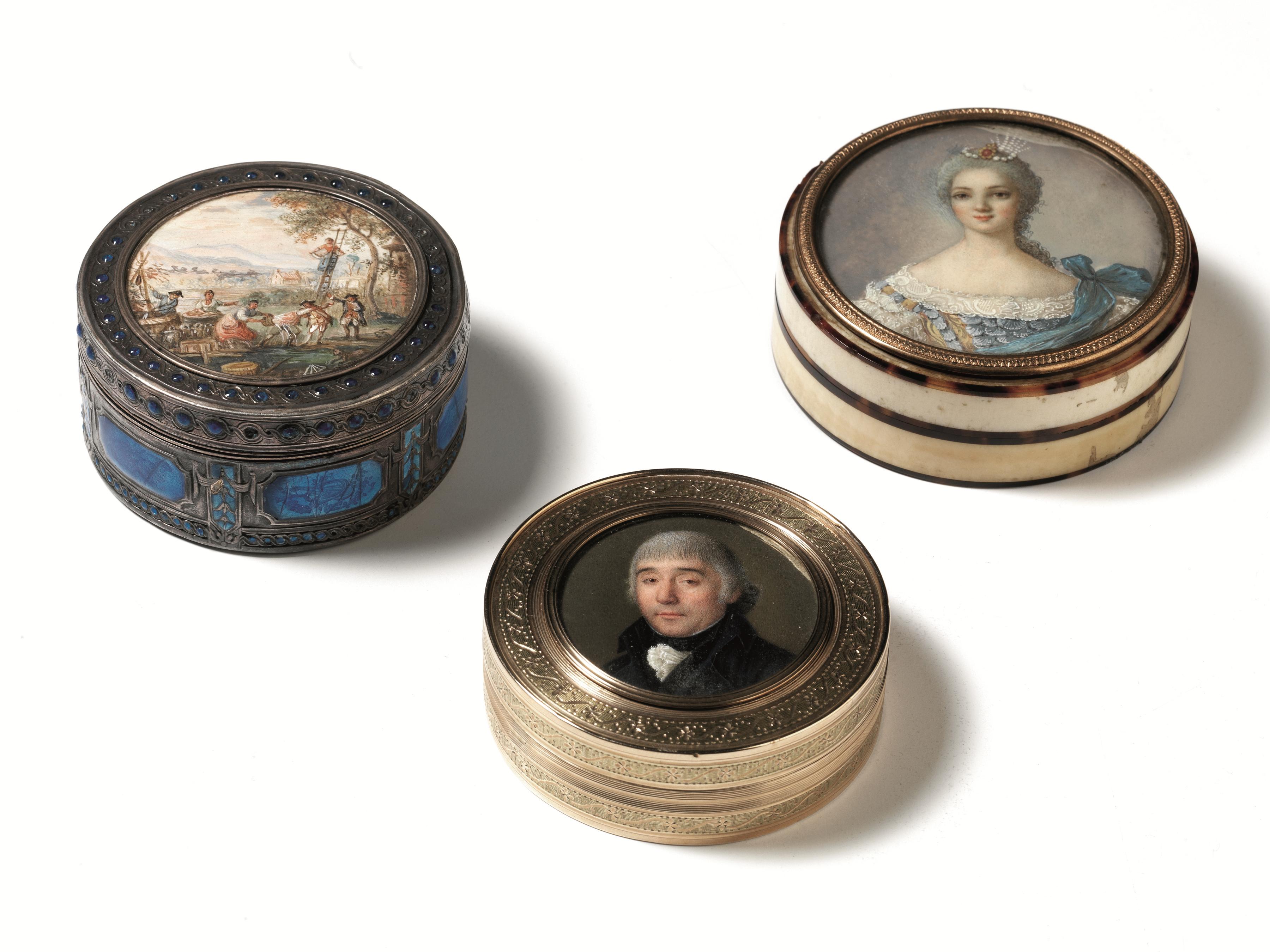 Bomboniera, sec. XIX, di forma circolare in argento inciso e smalto turchese, coperchio pitturato a scena di vita campestre, doratura interna, diam. cm 7, alt. cm 3.5; bomboniera, sec. XIX, di forma circolare, in oro giallo a basso titolo, interno in tartaruga coperchio con miniatura raffigurato un gentiluomo, diam. cm 7, alt. cm. 2,5; scatolina, sec. XIX, di forma circolare in avorio profilato in tartaruga bionda coperto con miniatura raffigurante gentildonna in abito azzurro, diam. cm 8, alt. cm 3; miniatura su avorio, entro cornice dorata, raffigurante scena di genere da Fragonard, cm 6x8,5, piccoli danni (4)