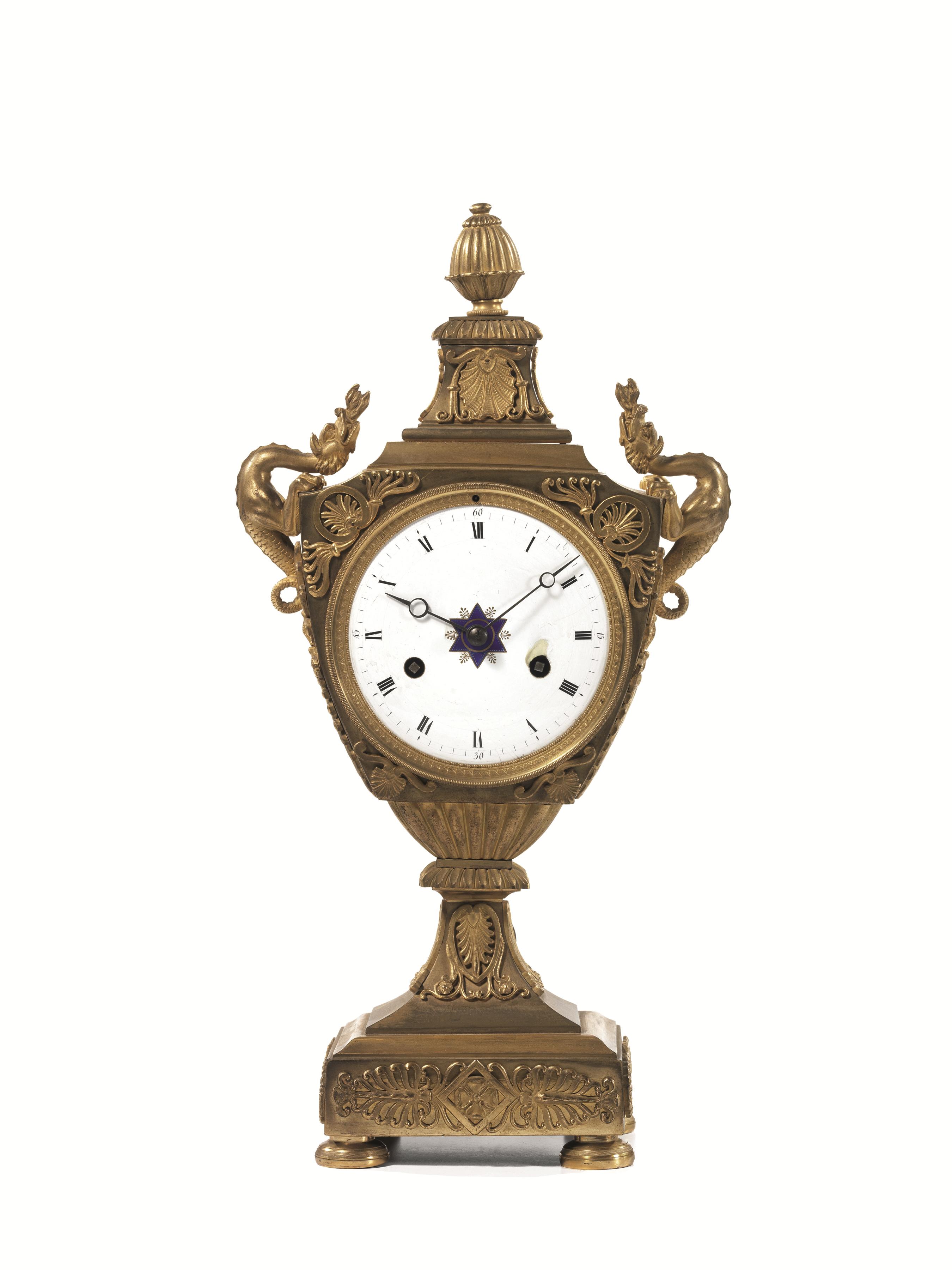 Lotto 255 | Orologio da tavolo, sec. XIX, in bronzo dorato in forma di vaso, base...