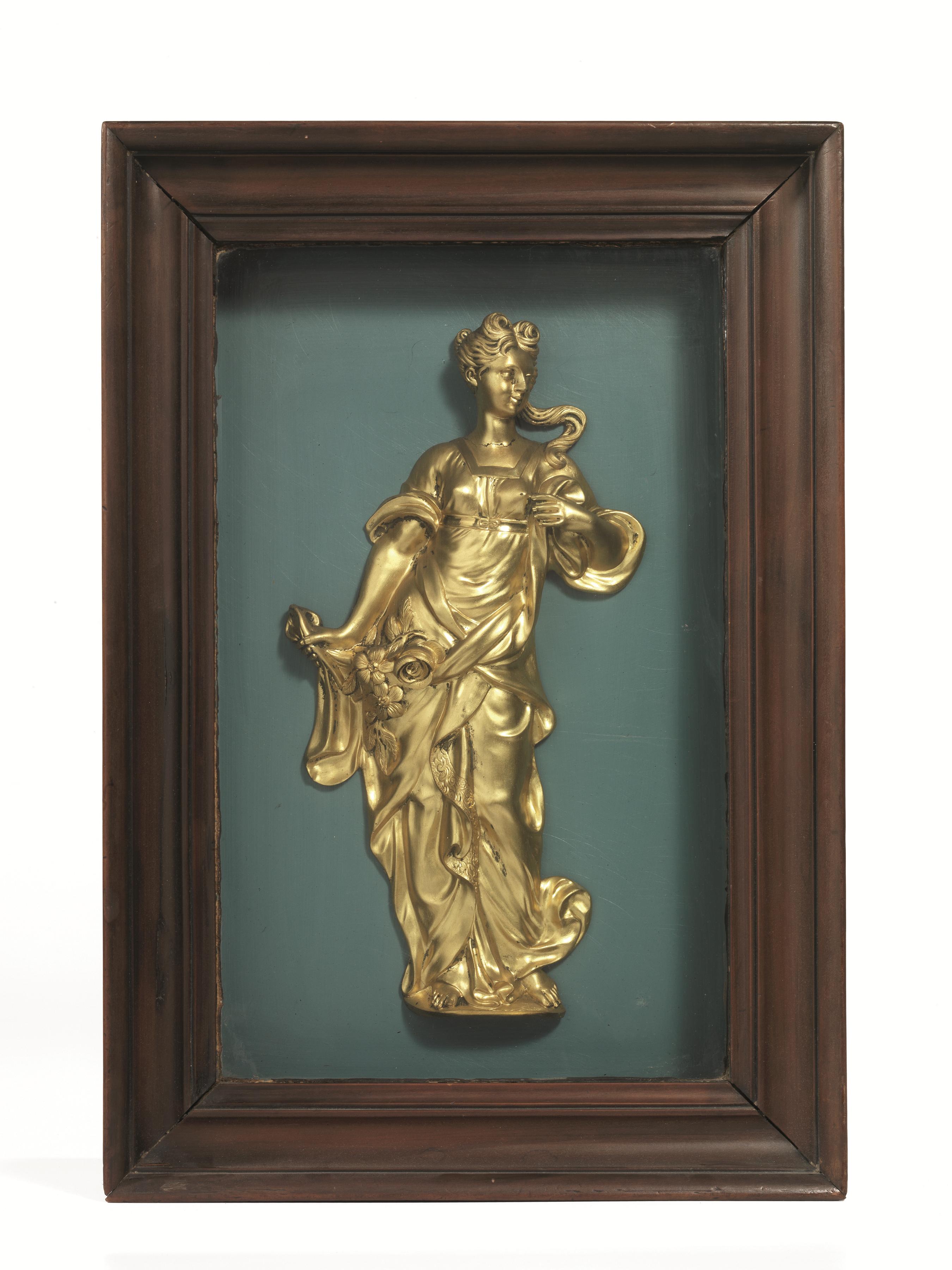 Quattro altorilievi, sec. XIX, in bronzo dorato, raffiguranti allegorie delle Stagioni, alt. cm 30, entro cornice, alt. cm 47, filature alla base del collo di Primavera e Estate, alcune cadute nella doratura