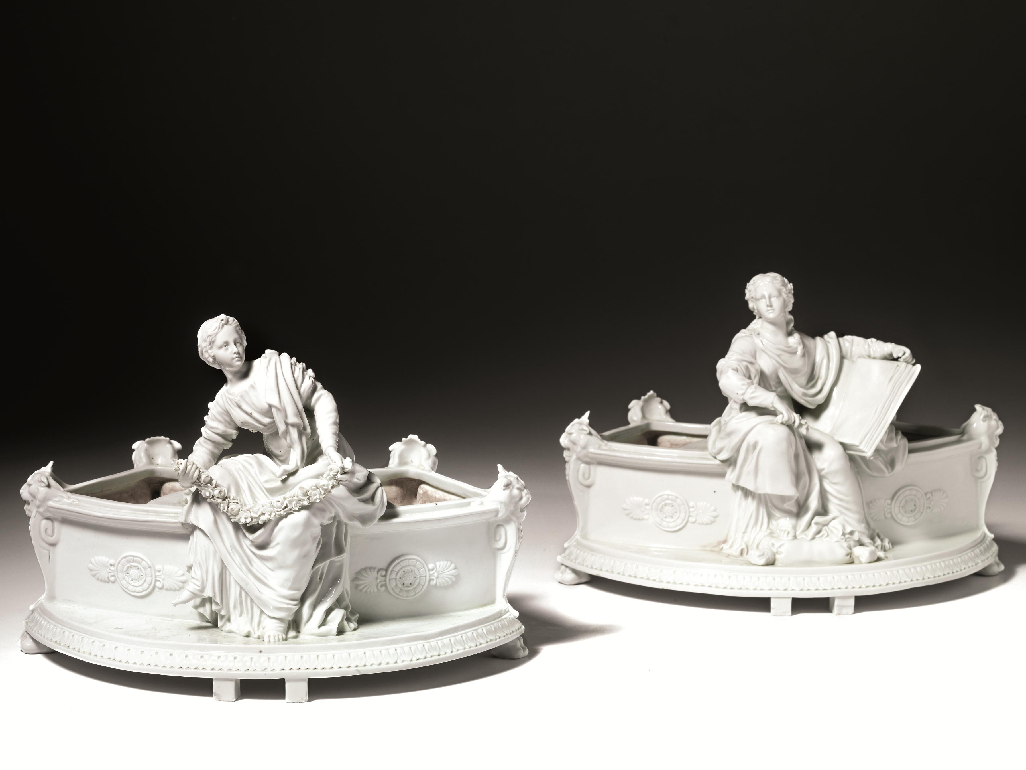 Coppia di vaschette porta fiori, Capodimonte sec. XIX, in porcellana bianca e biscuit ciascuna realizzata come una vasca su cui siedono figure femminili allegoriche, basi semicircolari, cm 32x25x23, una figura con testa restaurata e lievi danni alle mani (2)