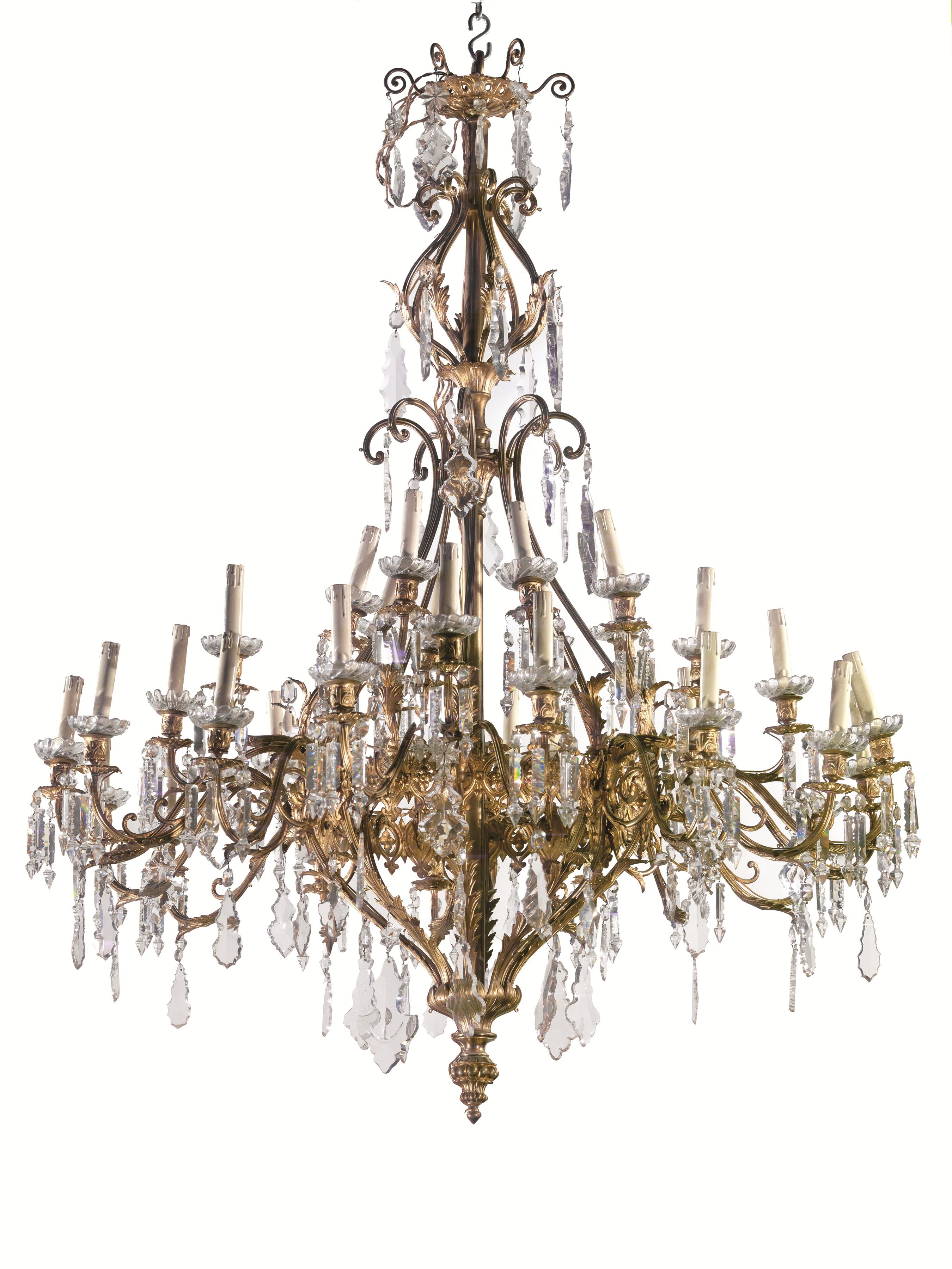 Lumiera, in metallo dorato con pendenti in cristallo tagliato a due ordini di luci, bracci ricurvi per complessive trenta luci, diam. cm 130