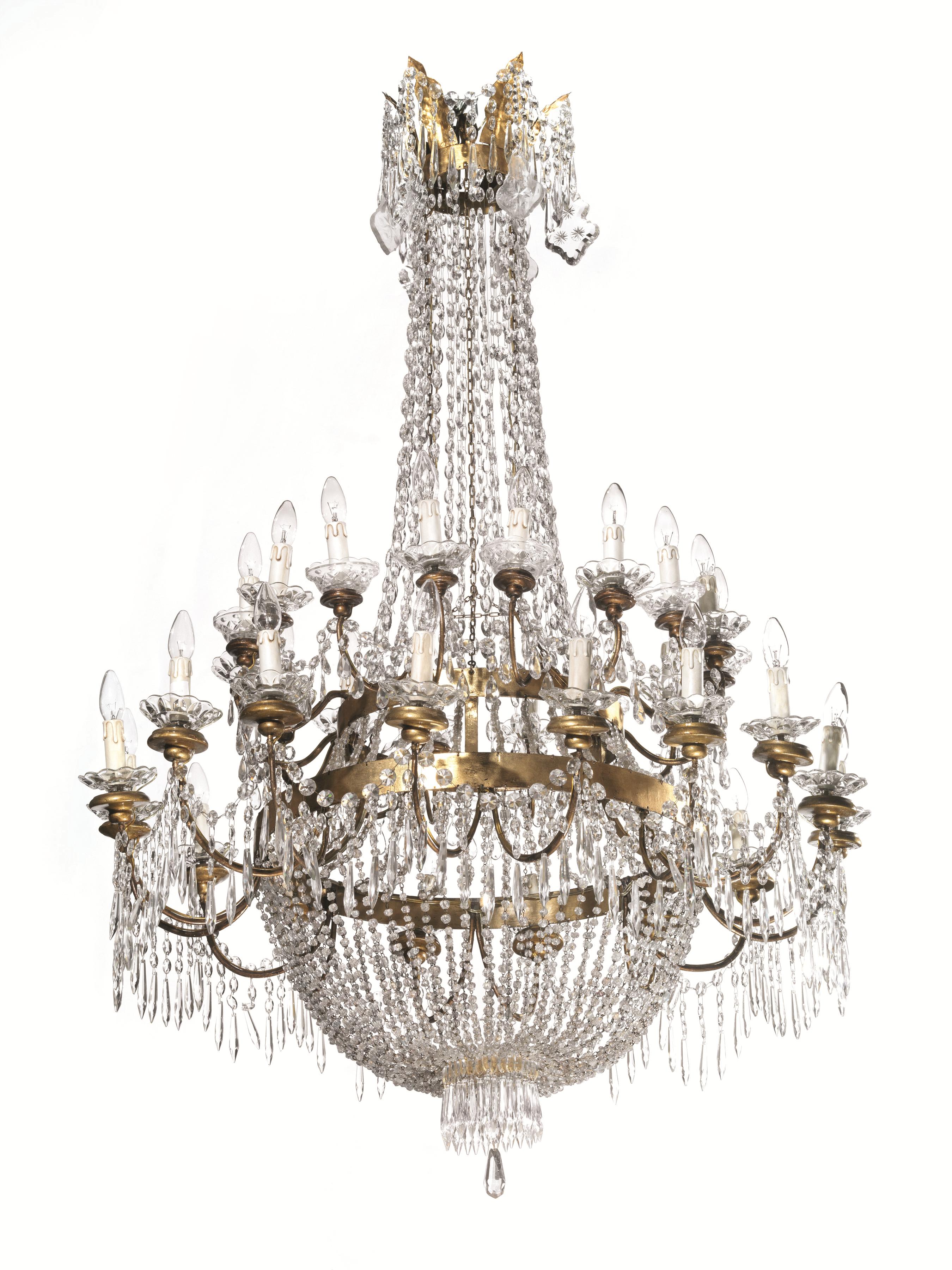 Grande lumiera a paniera, sec. XIX, in bronzo dorato a due ordini di luci con collane e pendenti in cristallo, trentadue luci complessive, piccole mancanze
