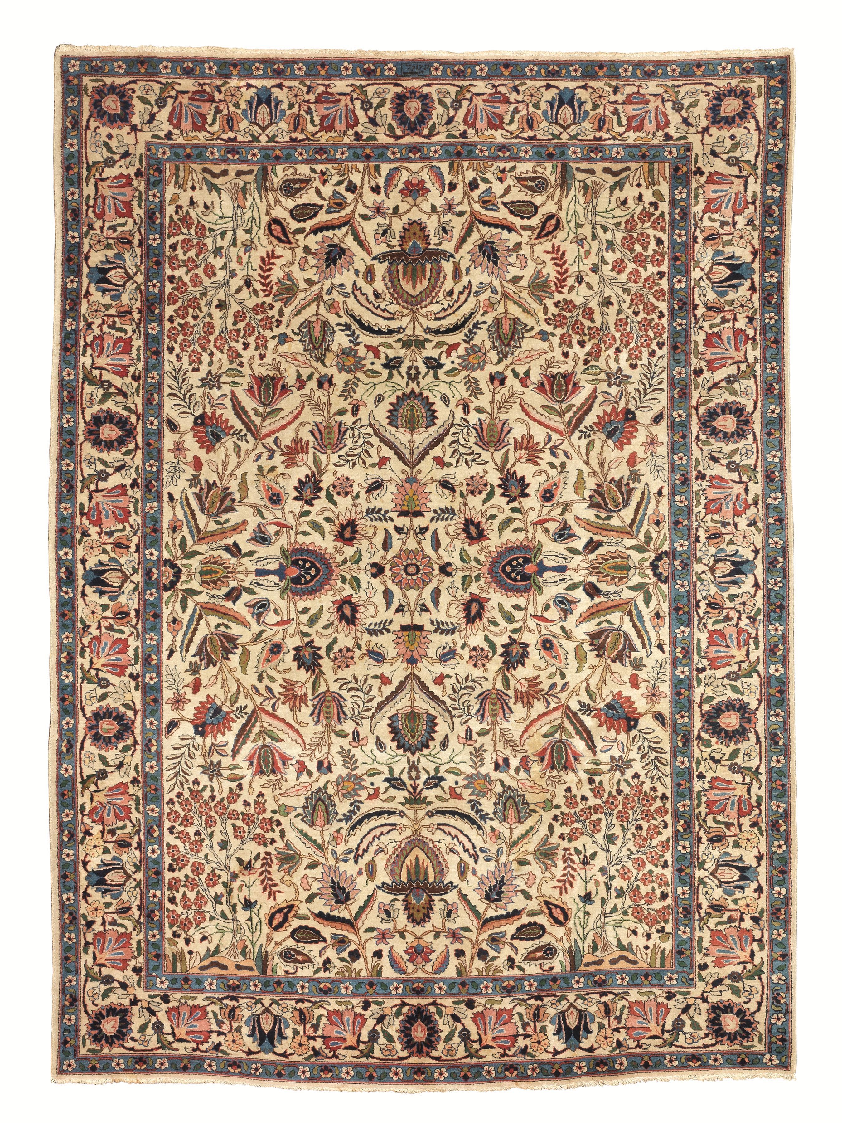 Tappeto persiano Tabriz, inizi sec. XX, fondo color crema, finemente decorato con volute di fiori e foglie nei toni del rosso, rosa, verde e giallo, bordura avorio con foglie blu, rosa e azzurre, cm 310x220