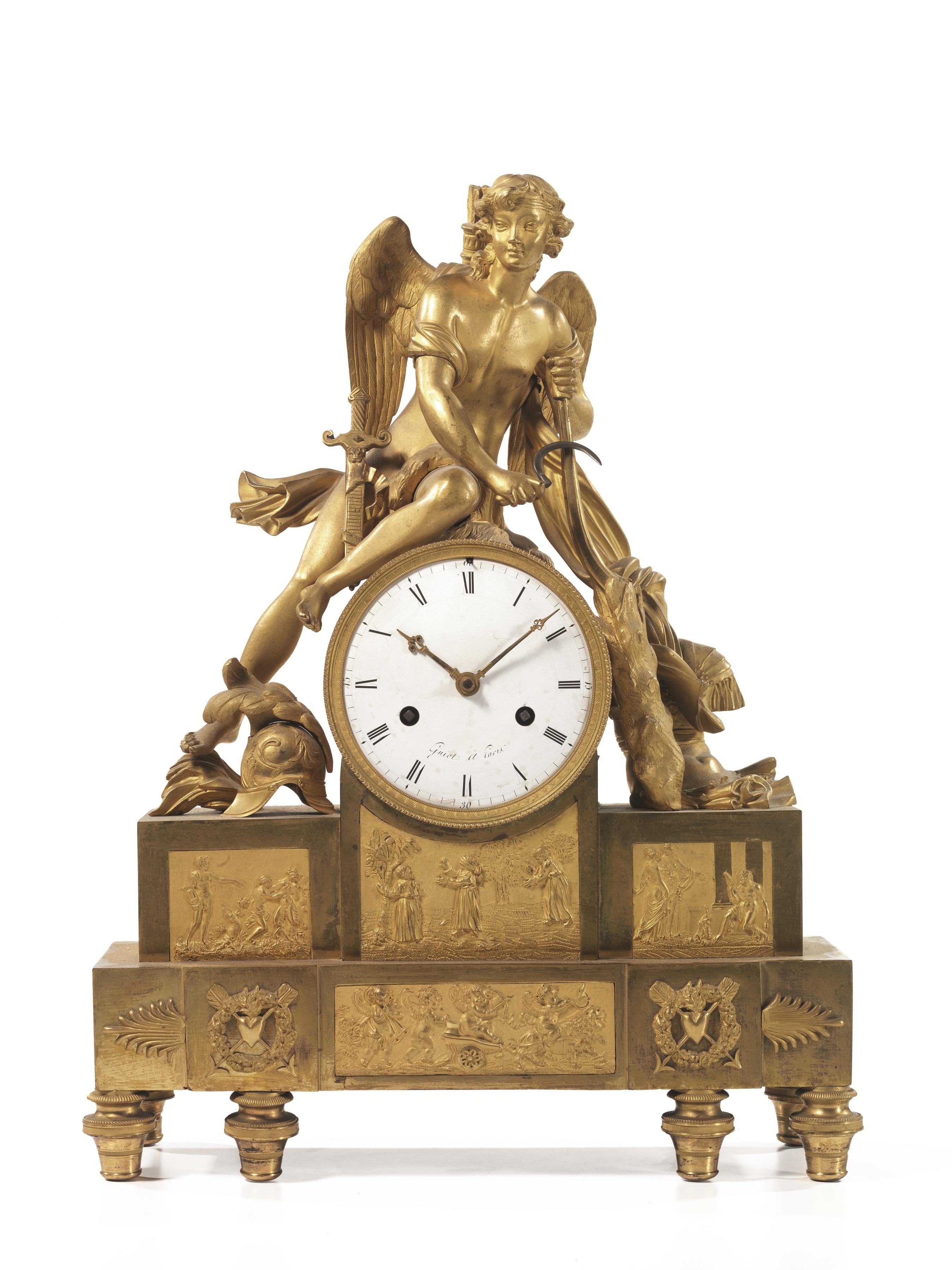 Orologio da tavolo, sec. XIX, in bronzo dorato, cassa sormontata da Cupido alato, quadrante in smalto bianco con numeri romani, alt. cm 49