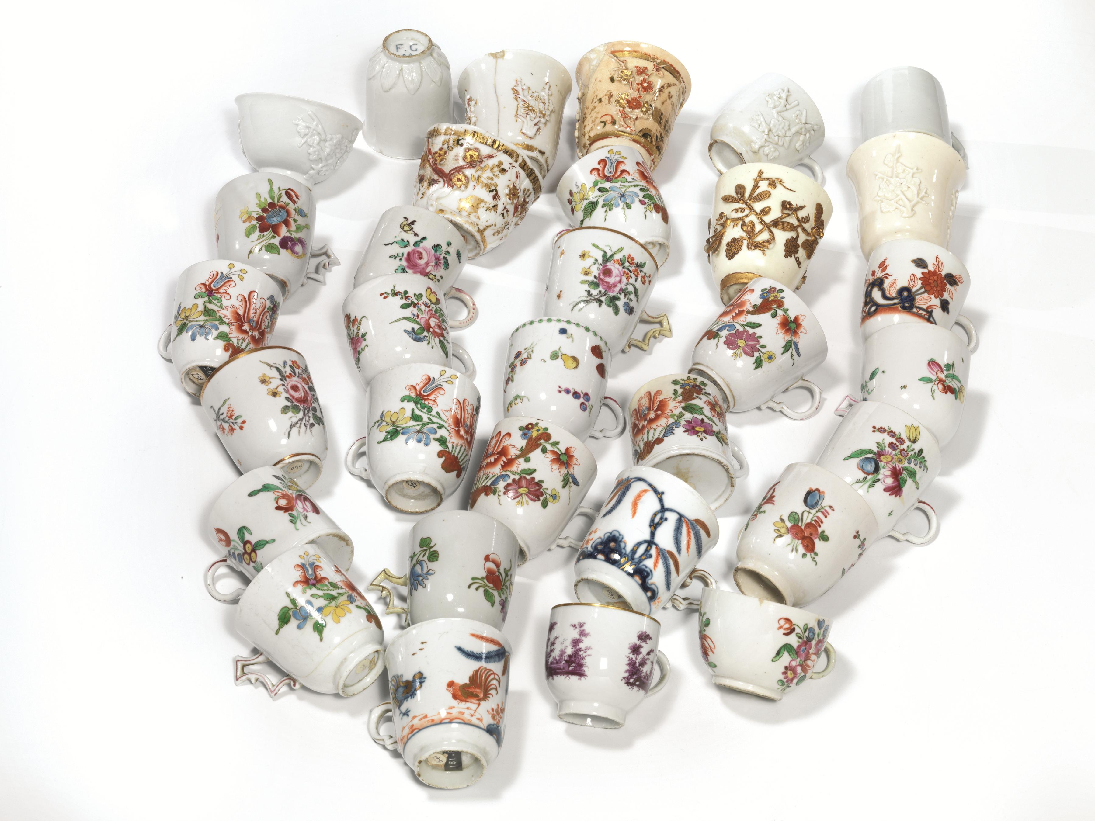 Trenta tazzine e quattro piattini, manifattura Ginori e manifatture varie, secc. XVIII-XIX, in porcellana decorata a motivo del “mazzetto”, “del galletto” e a fiori in rilievo, alcuni danni e restauri (34)