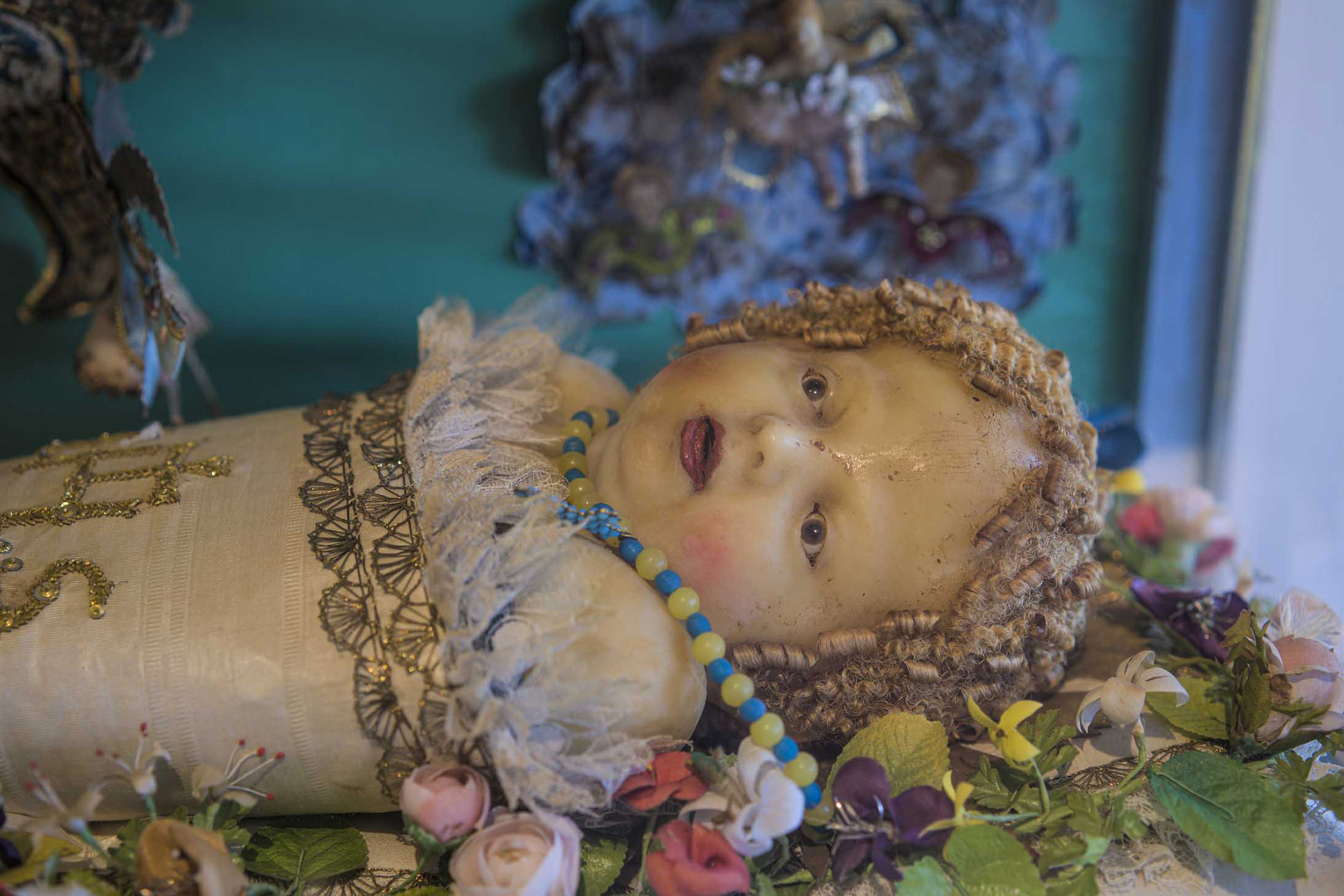 lunghezza Gesù Bambino cm 48 circa, teca in vetro cm 69x27,7x38,8