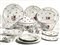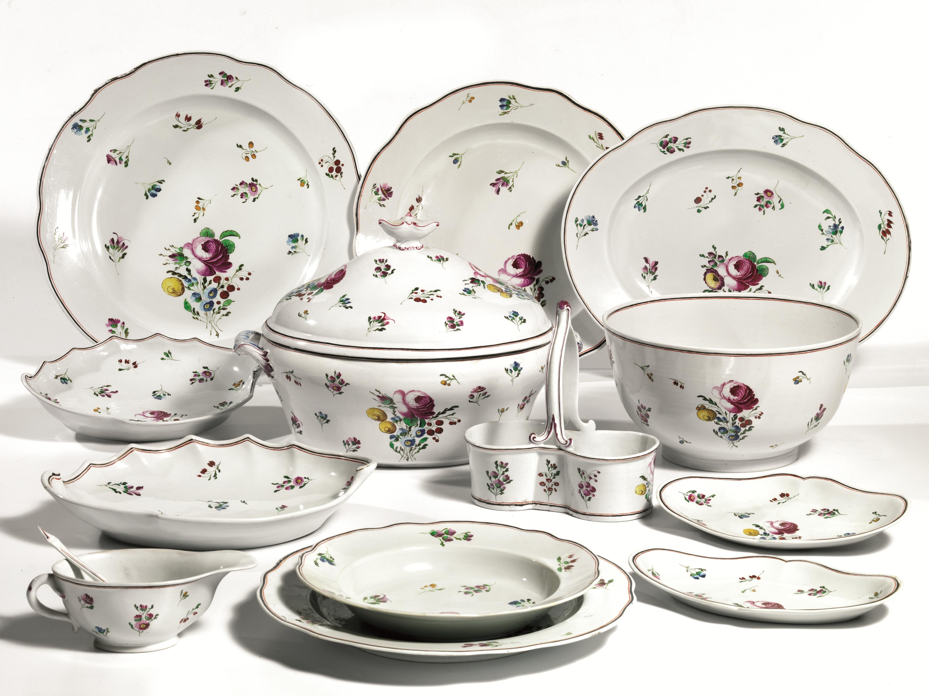 Composizione: 36 piatti piani; 18 piatti fondi; 2 vassoietti ovali sagomati piccoli; 2 zuppiere con coperchio di due misure; 1 salsiera con cucchiaio; 1 oliera; 3 insalatiere di tre misure; 2 vassoietti modellati a conchiglia di due misure; 2 raviere; 9 piattini di forma quadrata sagomata; 14 vassoi ovali di varie misure; 5 vassoi tondi di varie misure