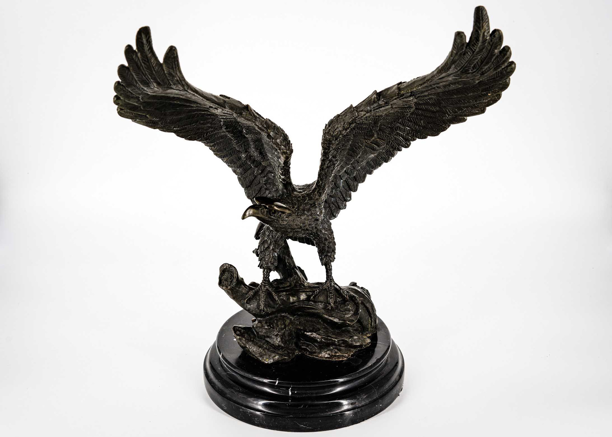 scultura in bronzo brunito su base in marmo, raffigurante un'aquila in atto di prendere il volo con le ali aperte