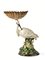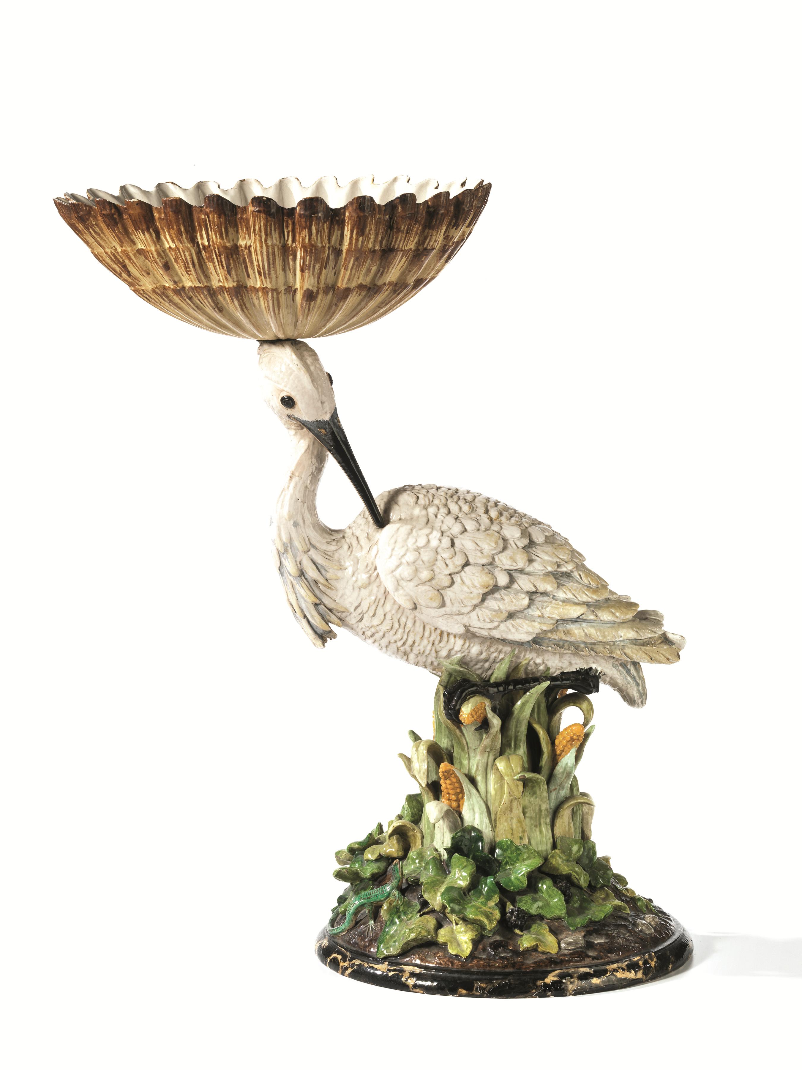 Grande alzata, manifattura Ginori, fine sec. XIX, in maiolica policroma, in forma di cicogna poggiante su una base realisticamente modellata come un prato e grande coppa a conchiglia sul capo, alt. cm 80