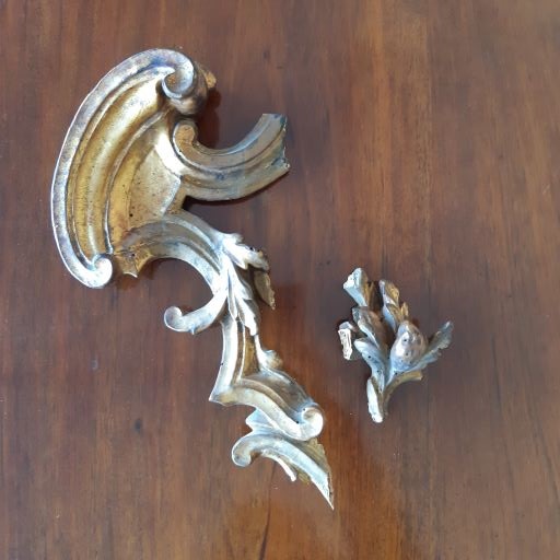 in legno riccamente intagliato e dorato; cimasa a timpano spezzato centrata da testa di putto alato scolpita a tutto tondo, fra volute vegetali ricadenti lungo i fianchi con racemi floreali, parte inferiore con gambe a volute contrapposte, pendaglina sagomata centrata da mascherone ferino; cornice interna modanata, specchio al mercurio originale