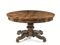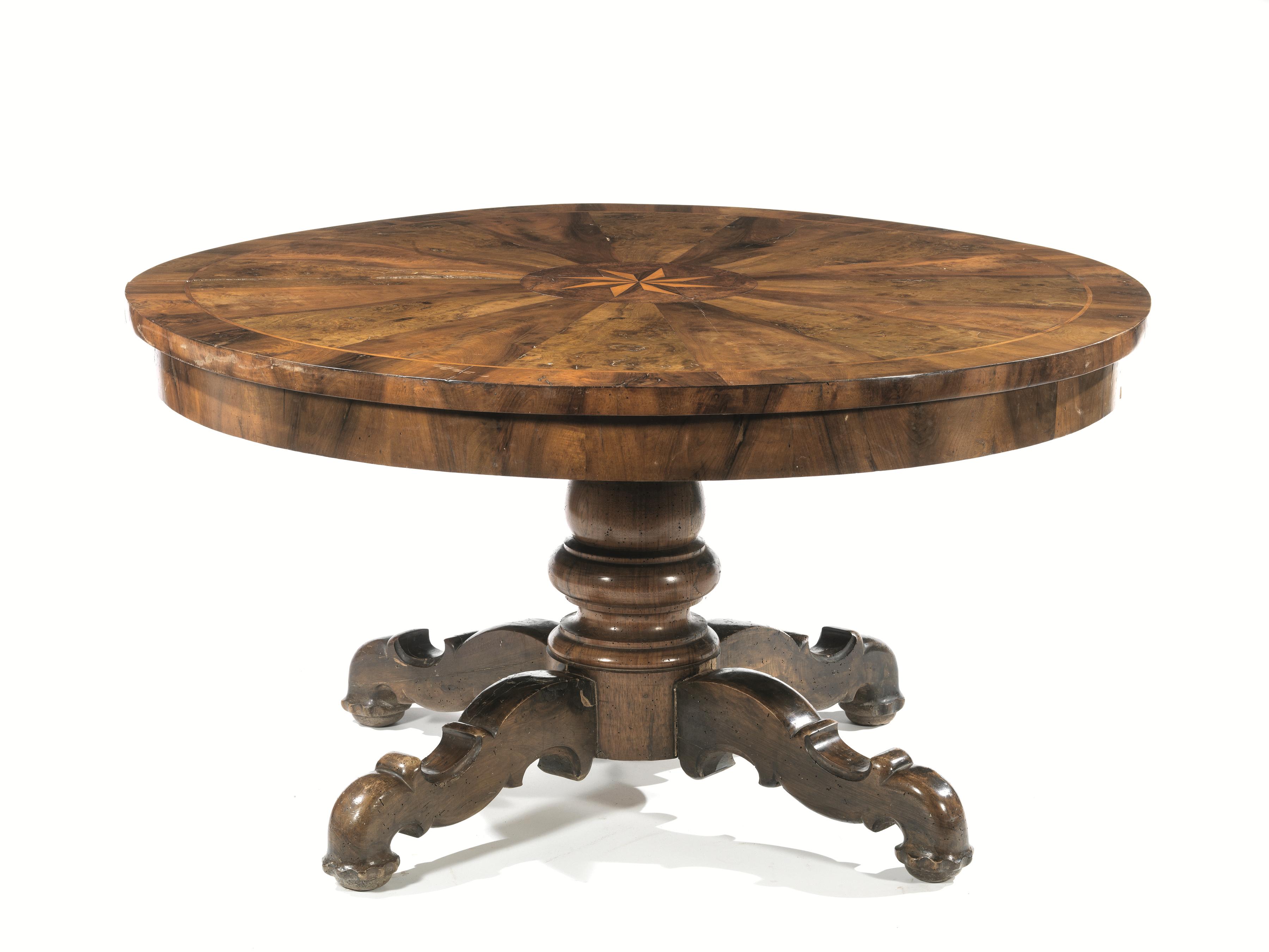 Tavolo da pranzo, Toscana, seconda metà sec. XIX, in noce e olivo intarsiati, piano circolare centrato da rosa dei venti, fusto a balaustro su quattro gambe a voluta, diam. cm 152, alt. cm 82, alcuni danni al piano
