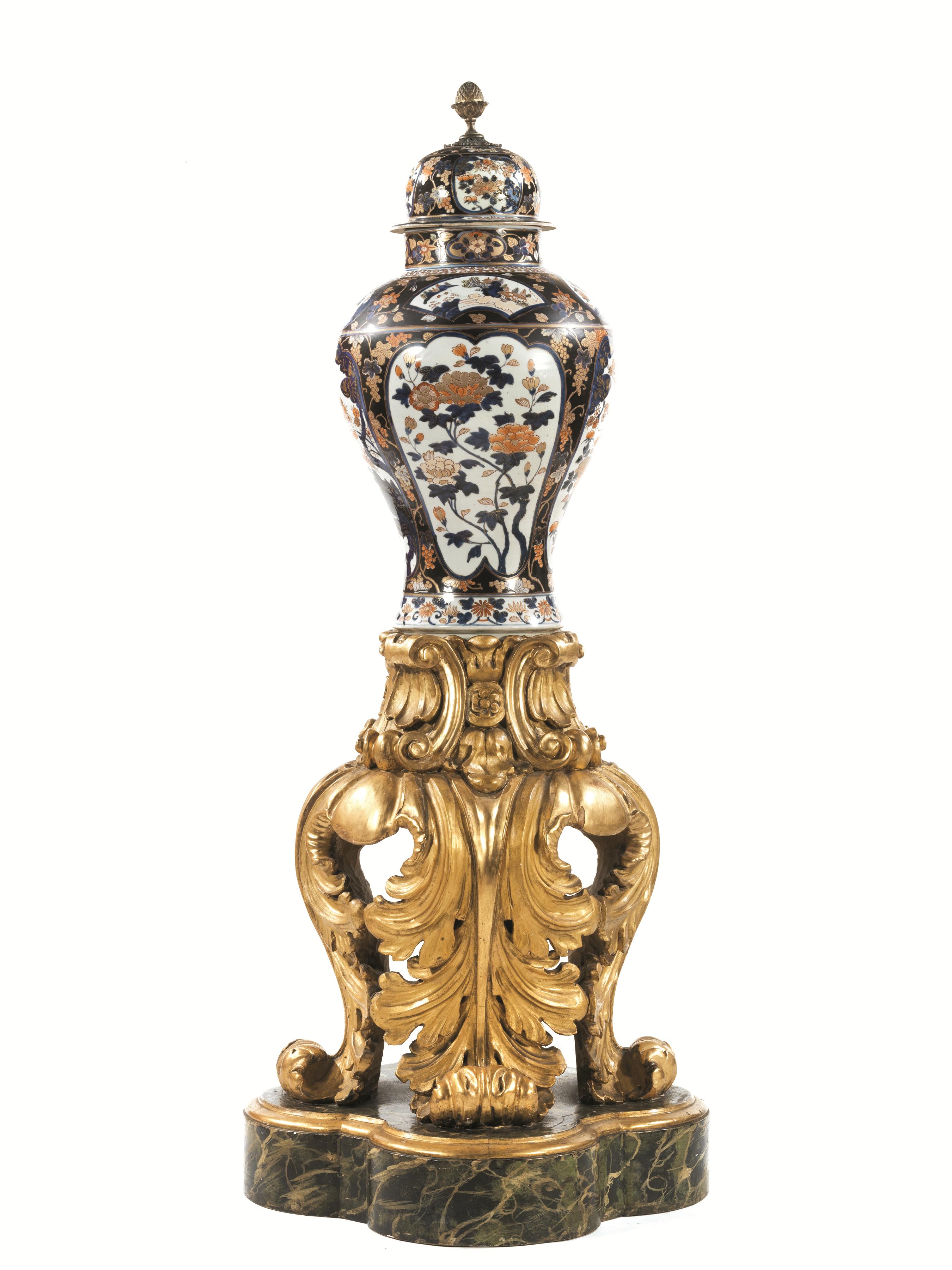 Vaso con coperchio, Giappone, sec. XIX, in porcellana Imari decorato con motivi floreali nei toni del blu, ruggine e oro, alt. cm 77, poggiante su base moderna in legno e intagliato e dorato a motivi fitomorfi