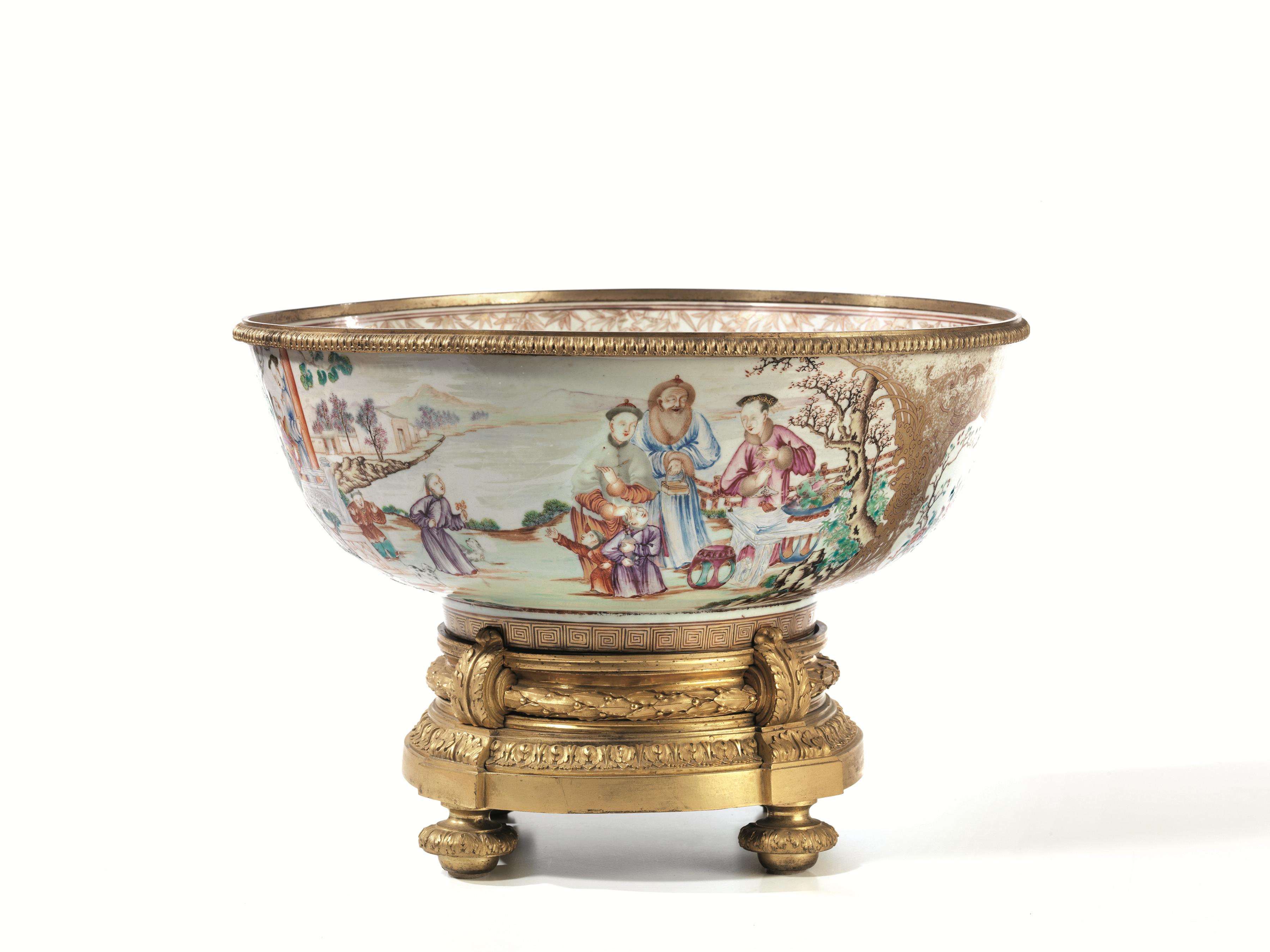 Coppa, Cina dinastia Qing, periodo Quianlong (1735 - 1796), in porcellana della famiglia rosa, Mandarin palette decorata con figure in un giardino sulle rive di un lago, montata in bronzo dorato, diam. cm 40, doratura parzialmente consunta