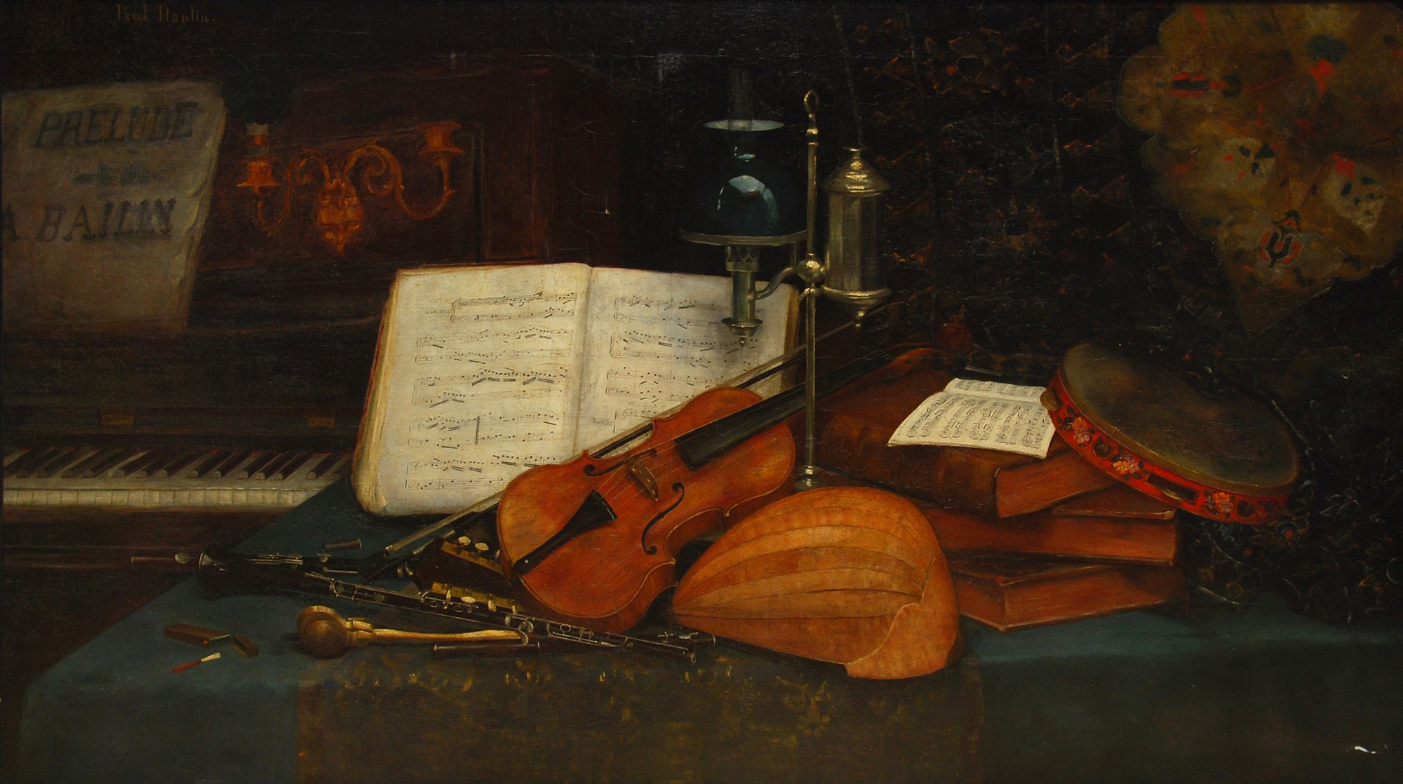 Paul Dantin (XIX - XX) olio su tela raff. natura morta con strumenti musicali firmato in alto a sinistra