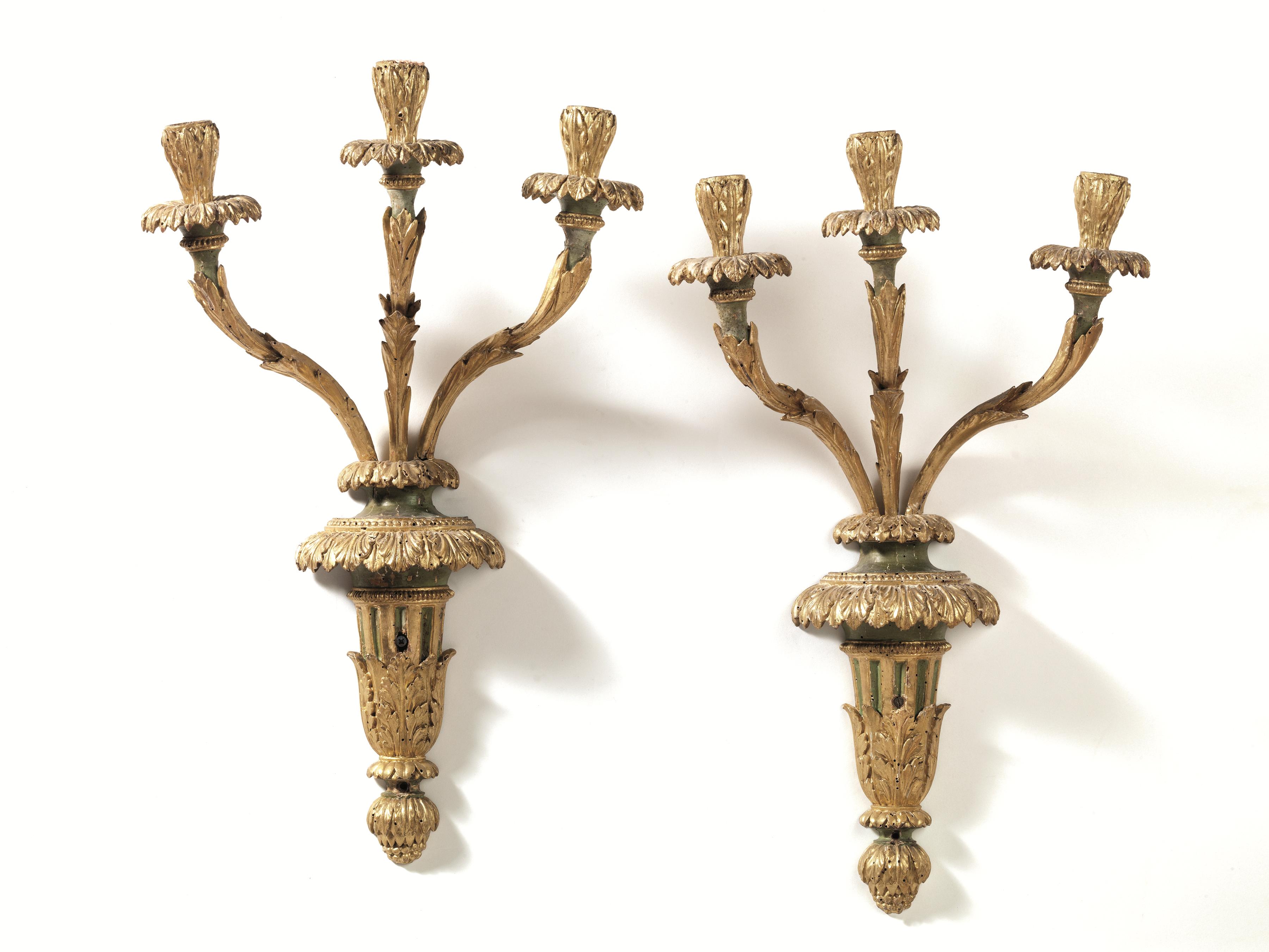 Coppia di appliques, Genova, seconda metà sec. XVIII, in legno intagliato e dorato e dipinto nei toni del verde, modellato come tre steli di foglie di acanto che fuoriescono da un vaso scannellato e decorato da grandi foglie in rilievo, alt. cm 61