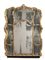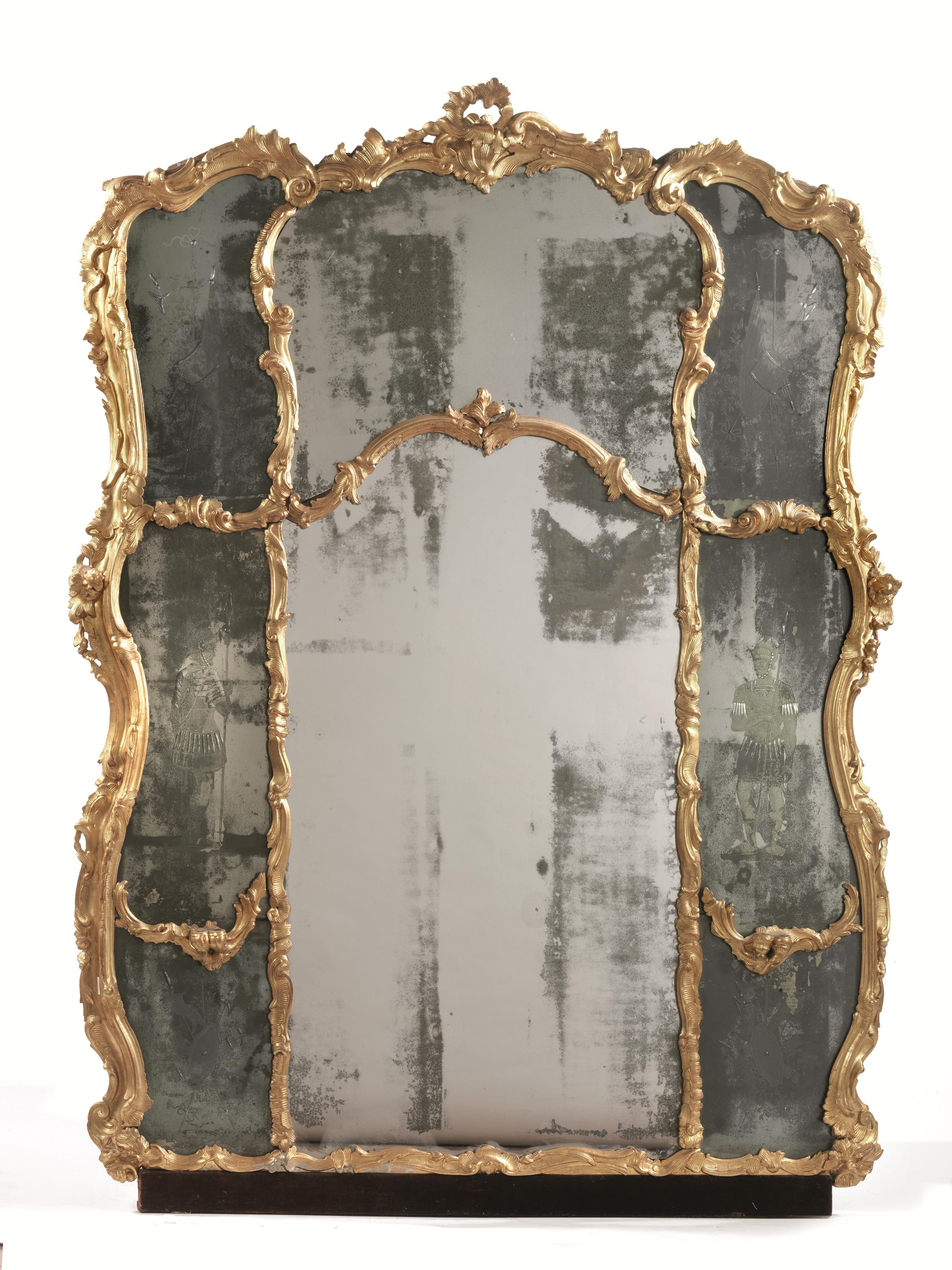 Specchiera, Venezia, sec. XVIII, di forma sagomata in cornice di legno intagliato e dorato a volute di fiori e foglie, specchi decorati da trofei d'armi e personaggi vestiti all'antica, luce composta di otto specchi, cm 209x156, restauri e doratura di epoca successiva