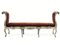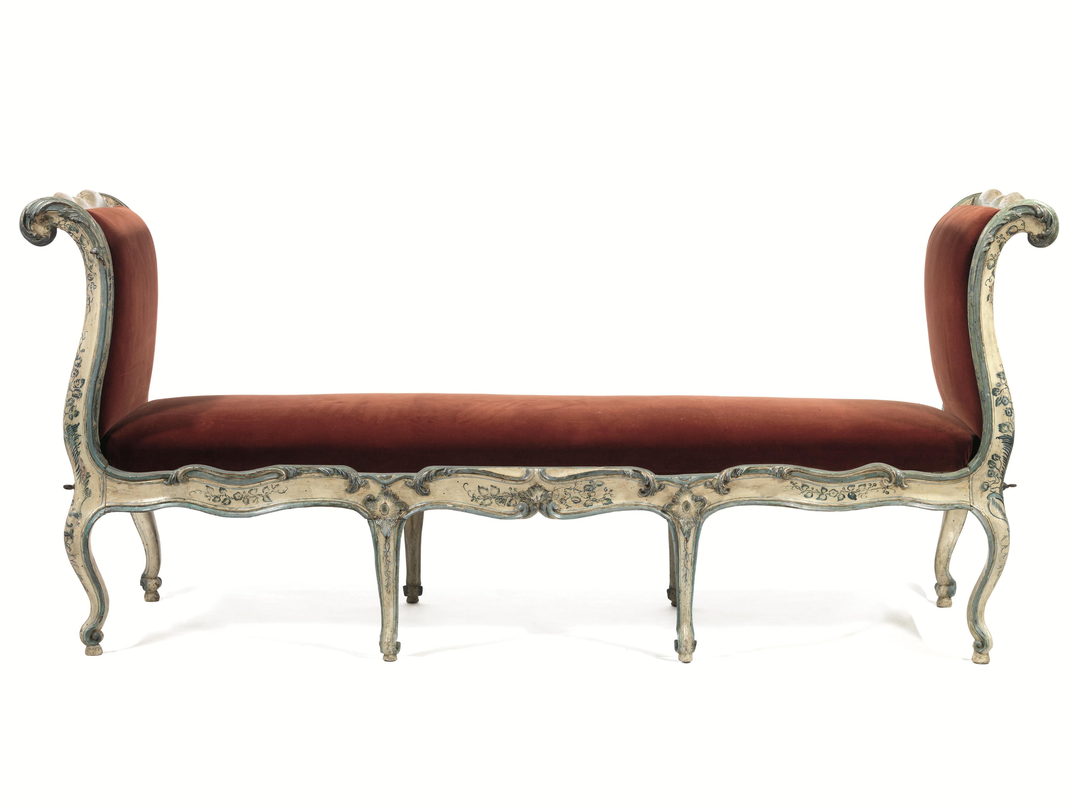 Divano a panchetta, Genova, metà sec. XVIII, in legno intagliato e dipinto nei toni del celeste e dell'avorio, braccioli a voluta, fascia sagomata dipinta a motivi floreali e rocaille, gambe mosse su piedi a ricciolo stilizzato, ricoperto in velluto rosso, cm 238, piccole cadute di colore