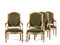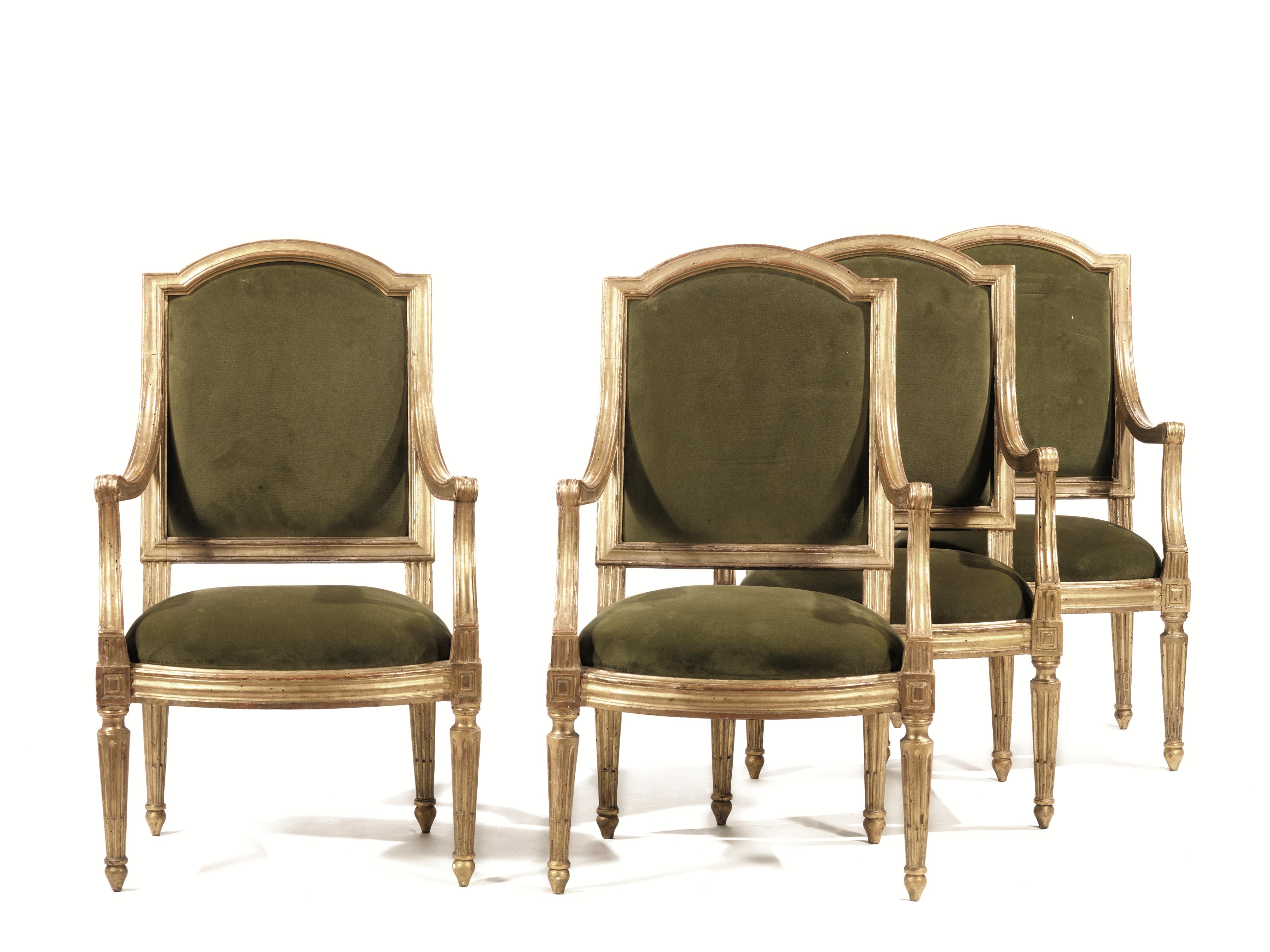 Quattro poltrone, Genova, ultimo quarto sec. XVIII, in legno intagliato e dorato, spalliera rettangolare centinata, braccioli a giorno con estremità a ricciolo su sostegni mossi, gambe tornite e scannellate su piedi a pigna ricoperti in velluto verde, restauri e riprese alla doratura (4)
