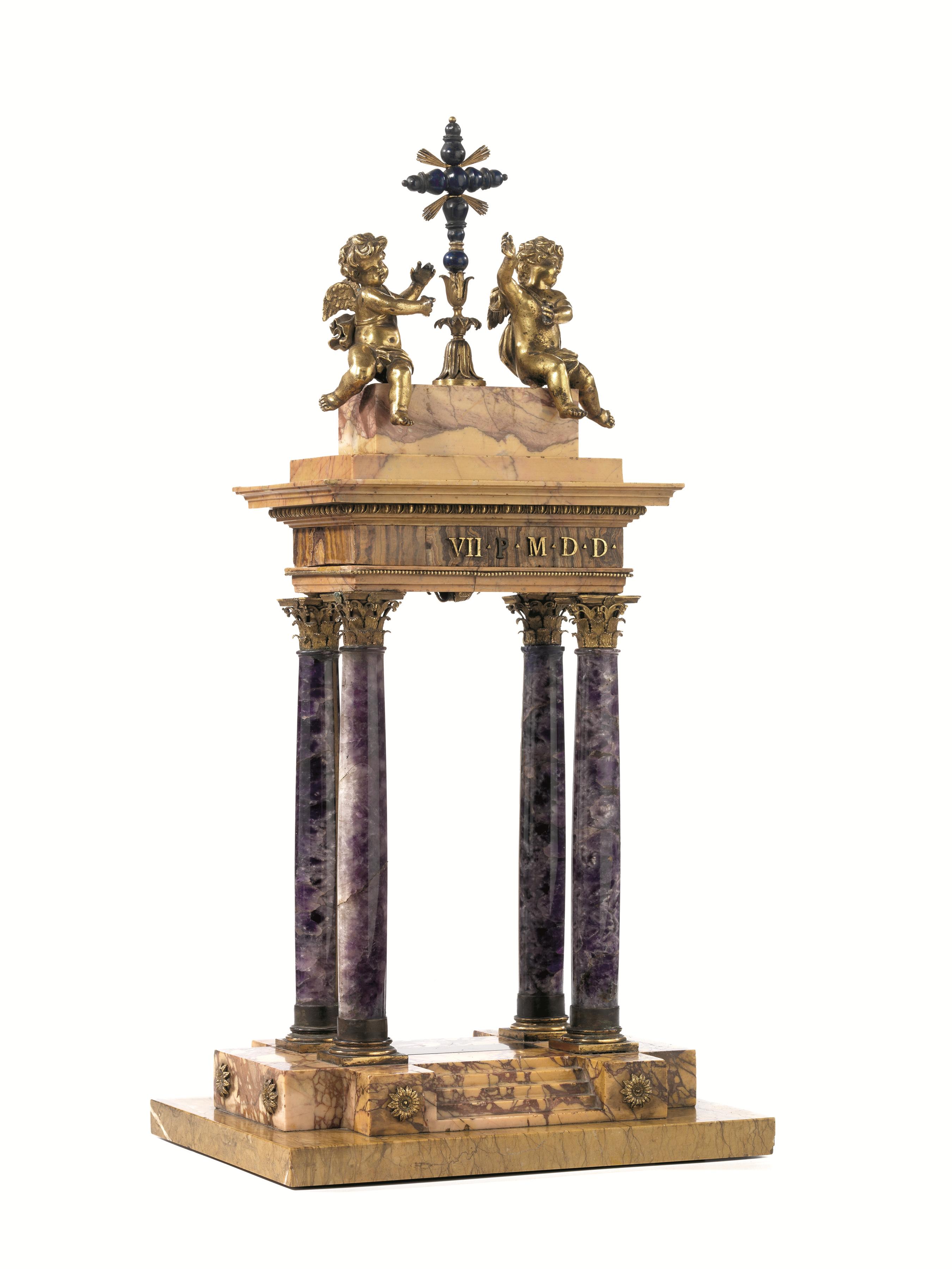 Tempietto, inizi sec. XIX, in giallo di Siena e marmi vari, a quattro colonne in blue-john, sormontato da due cherubini in bronzo dorato in adorazione della Croce in lapislazzuli su basamento rettangolare. Nel timpano iscrizione in bronzo dorato " ... VII.P.M.D.D.", alt. cm 62