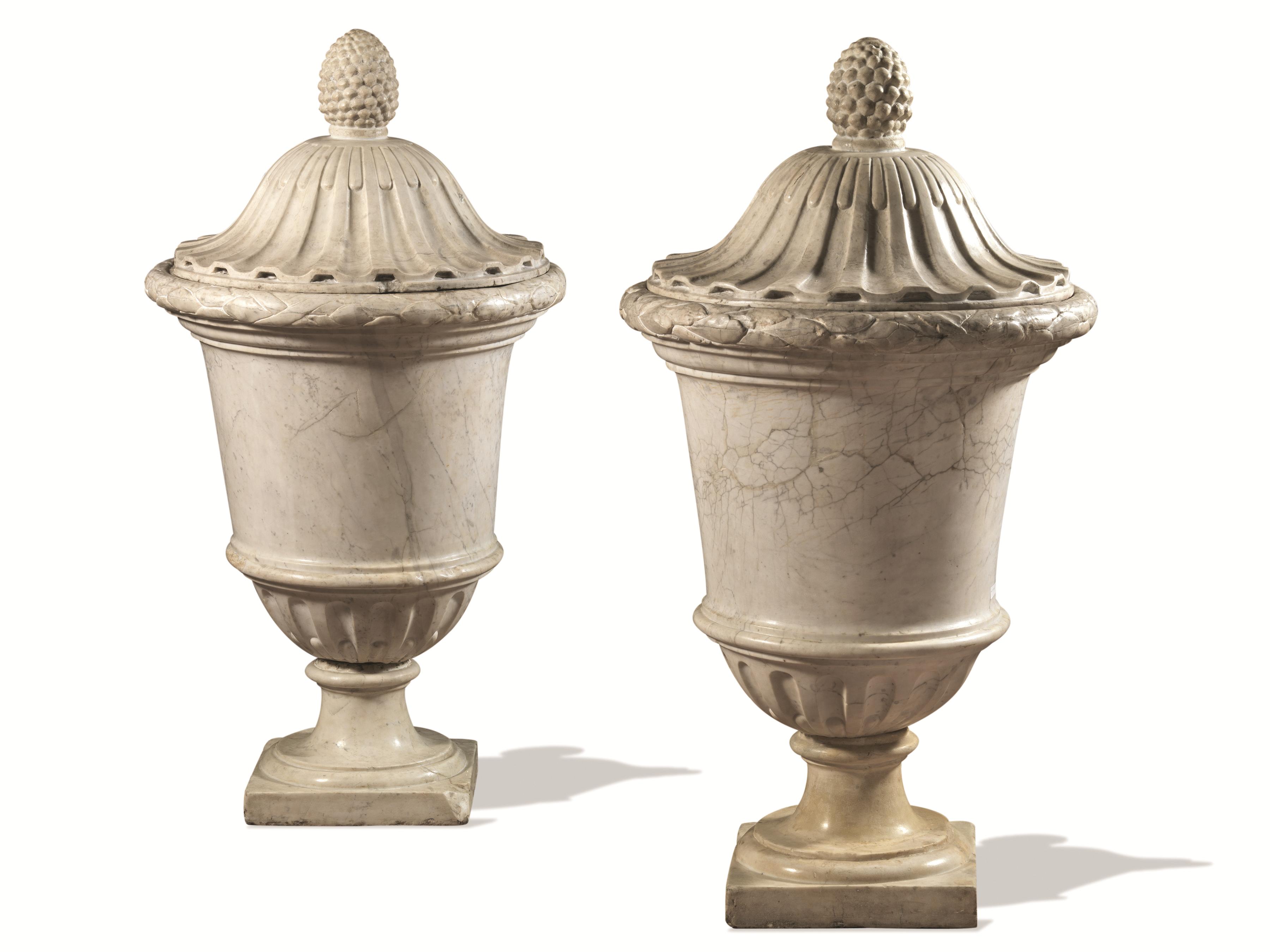 Coppia di grandi vasi, fine sec. XVIII, in marmo bianco scolpito, completi di coperchio baccellato con finale a pigna, bordo scolpito a tralcio di foglie, parte inferiore decorata a baccellatura e linguette su base quadrangolare modanata, alt. cm 120, restauri e integrazioni (2)