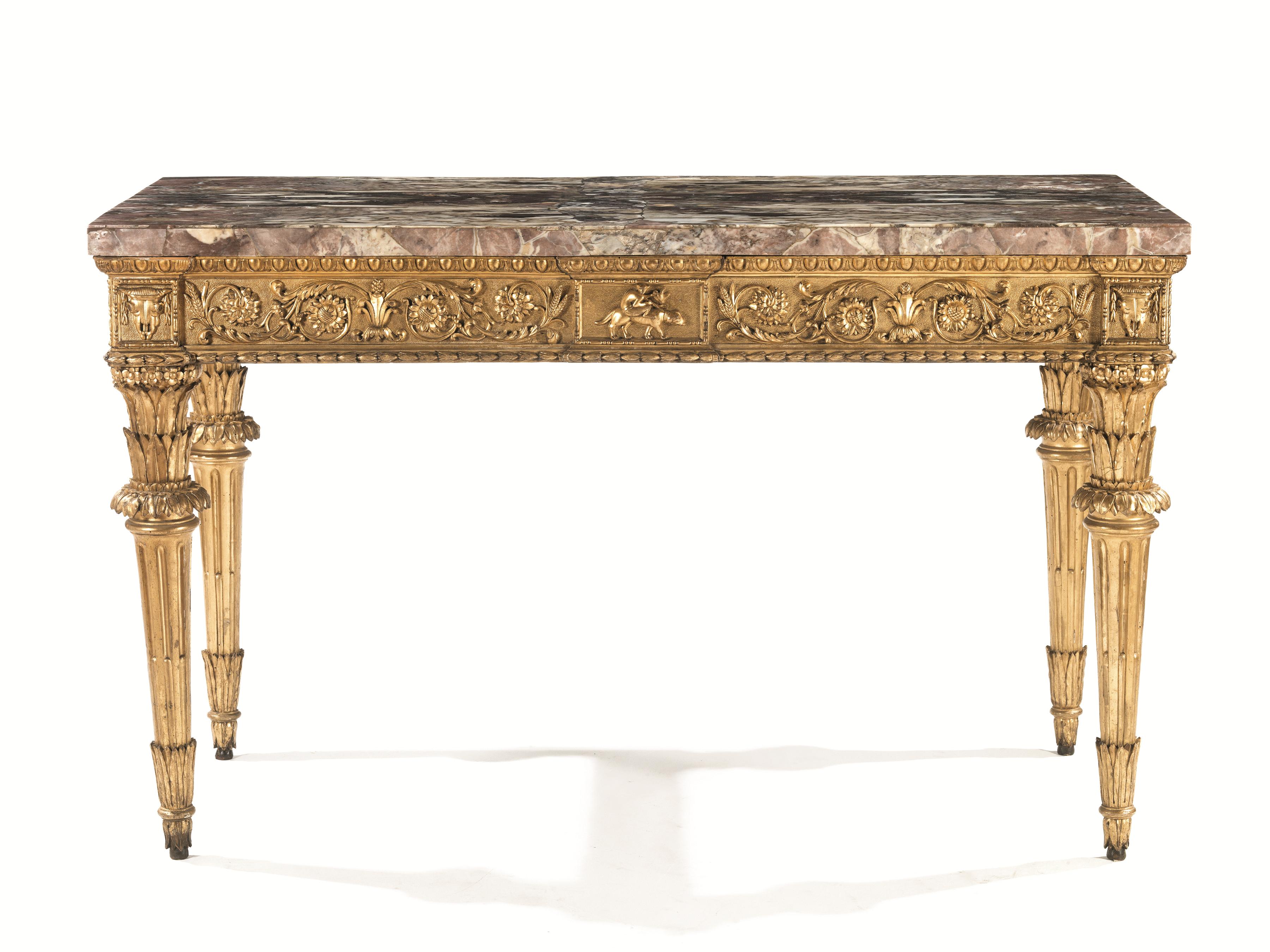 Grande console, Genova, ultimo quarto sec. XVIII, in legno riccamente scolpito e dorato, piano superiore rettangolare listrato in breccia di marmo rosa, fascia decorata da motivo a ovuli e dardi nella parte superiore, al centro da due grandi volute con girasoli e spighe di grano, intervallata da bucrani e scena satirica con scimmia che cavalca un cane, gambe scannellate con capitelli a foglie di acanto, piedi a palla, cm 155x79x96, piccole mancanze