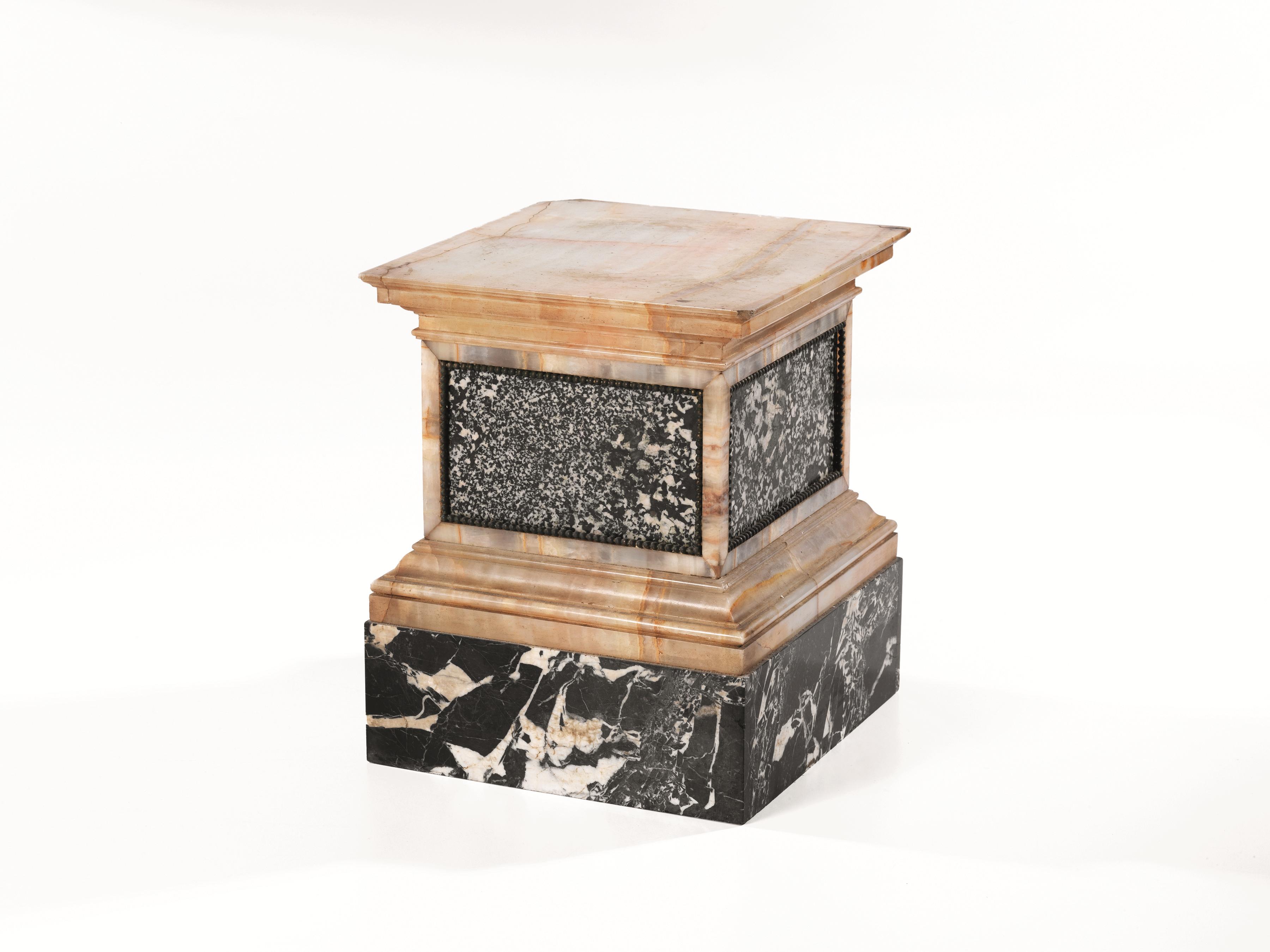 Base rettangolare per scultura, sec. XVIII, listrata in alabastro fiorito e breccia di marmo nero, profili in bronzo perlinato, alt. cm 22,5, piccoli danni