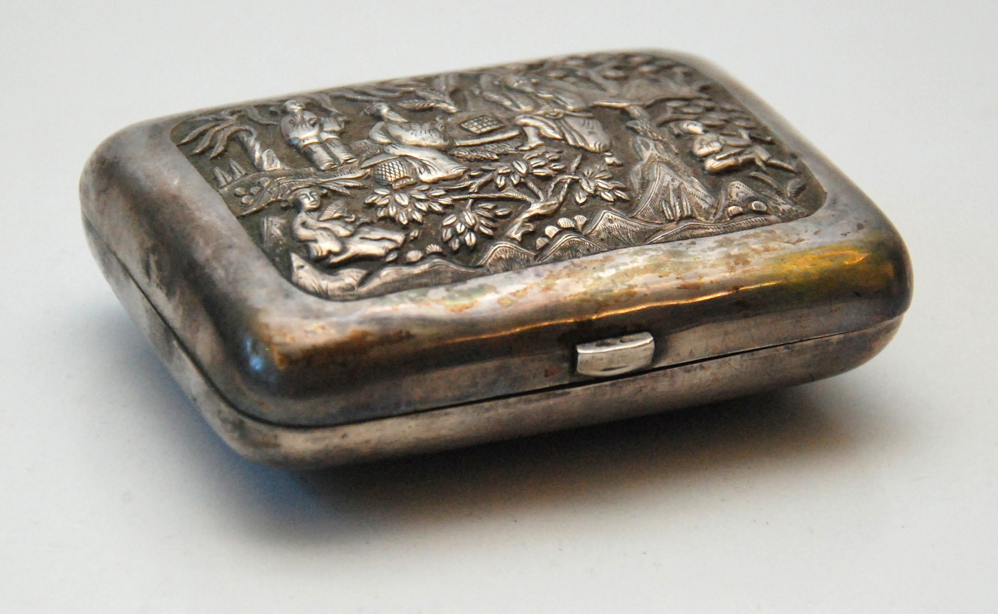 Scatolina in argento decorata con personaggi in mezzo alla vegetazione
