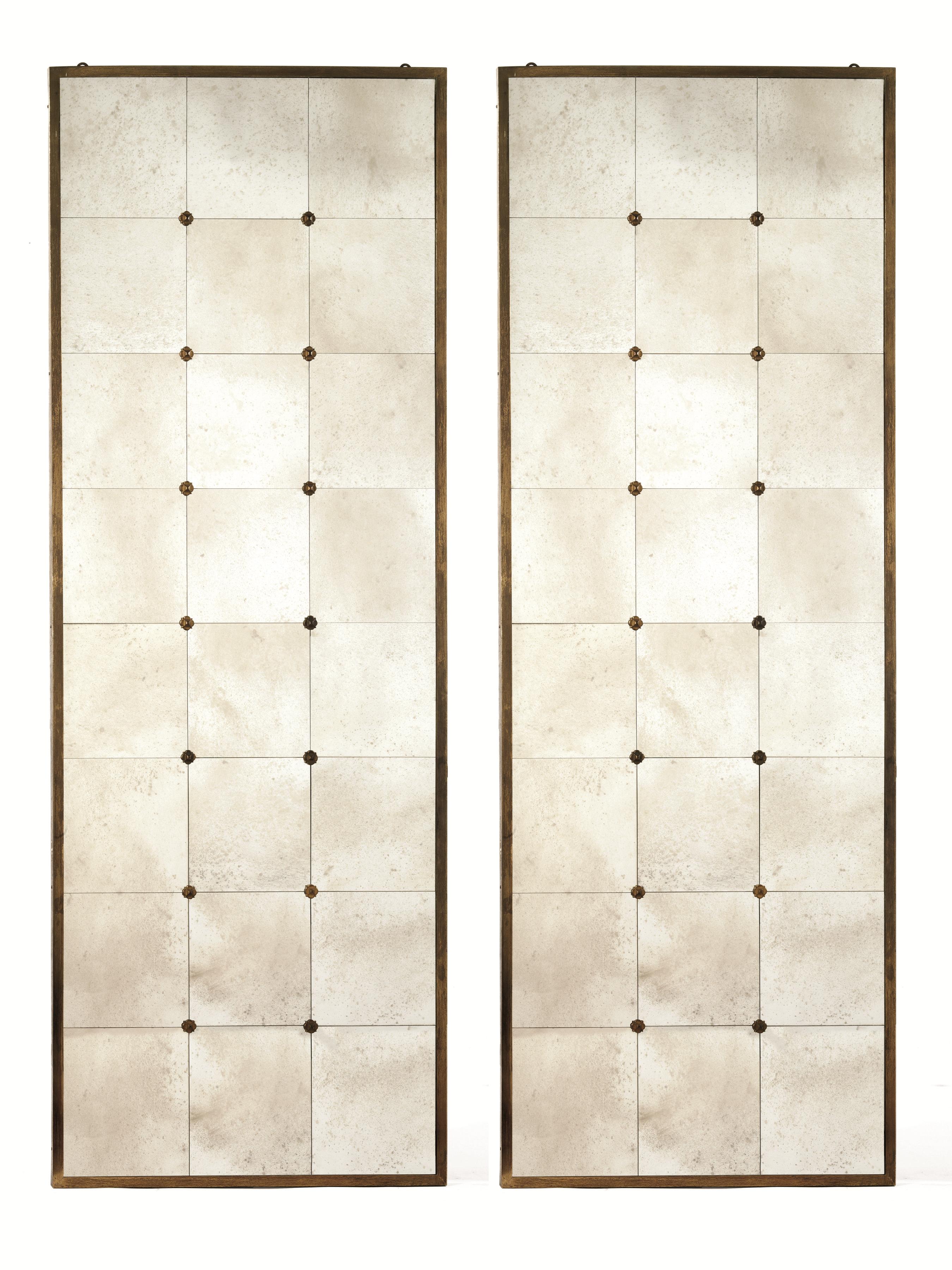 Due specchiere rettangolari con cornici in ottone, vetri antichizzati fermati da piccole rosette in bronzo, ed una specchiera simile, cm 203x74, piccoli danni (3)