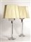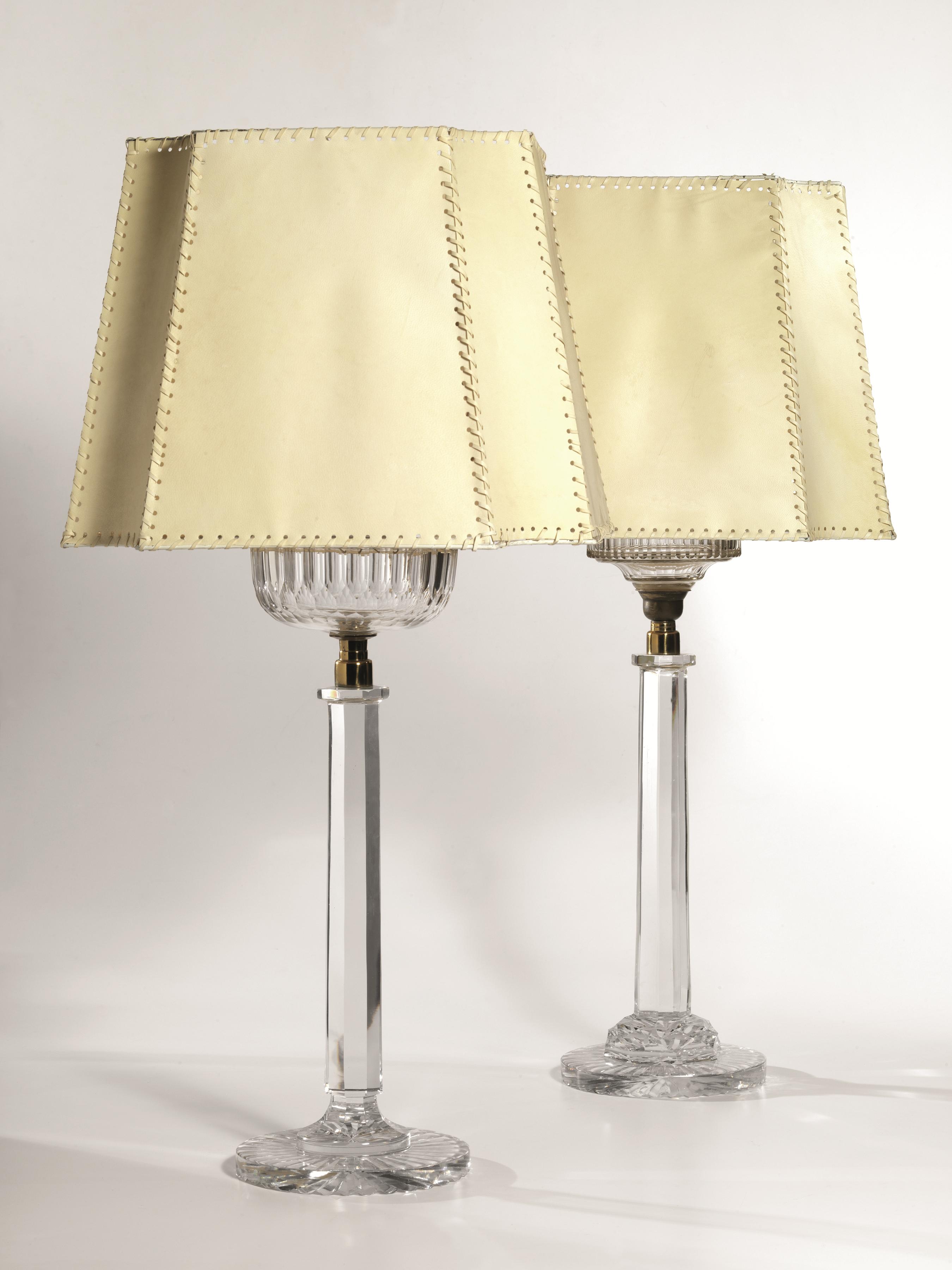 Due lumi da tavolo, in cristallo, fusto a colonna sfaccettata, piede circolare e coppe portaolio lievemente diverse, complete di applicazione elettrica e lumi in pergamena, alt. cm 88 (2)