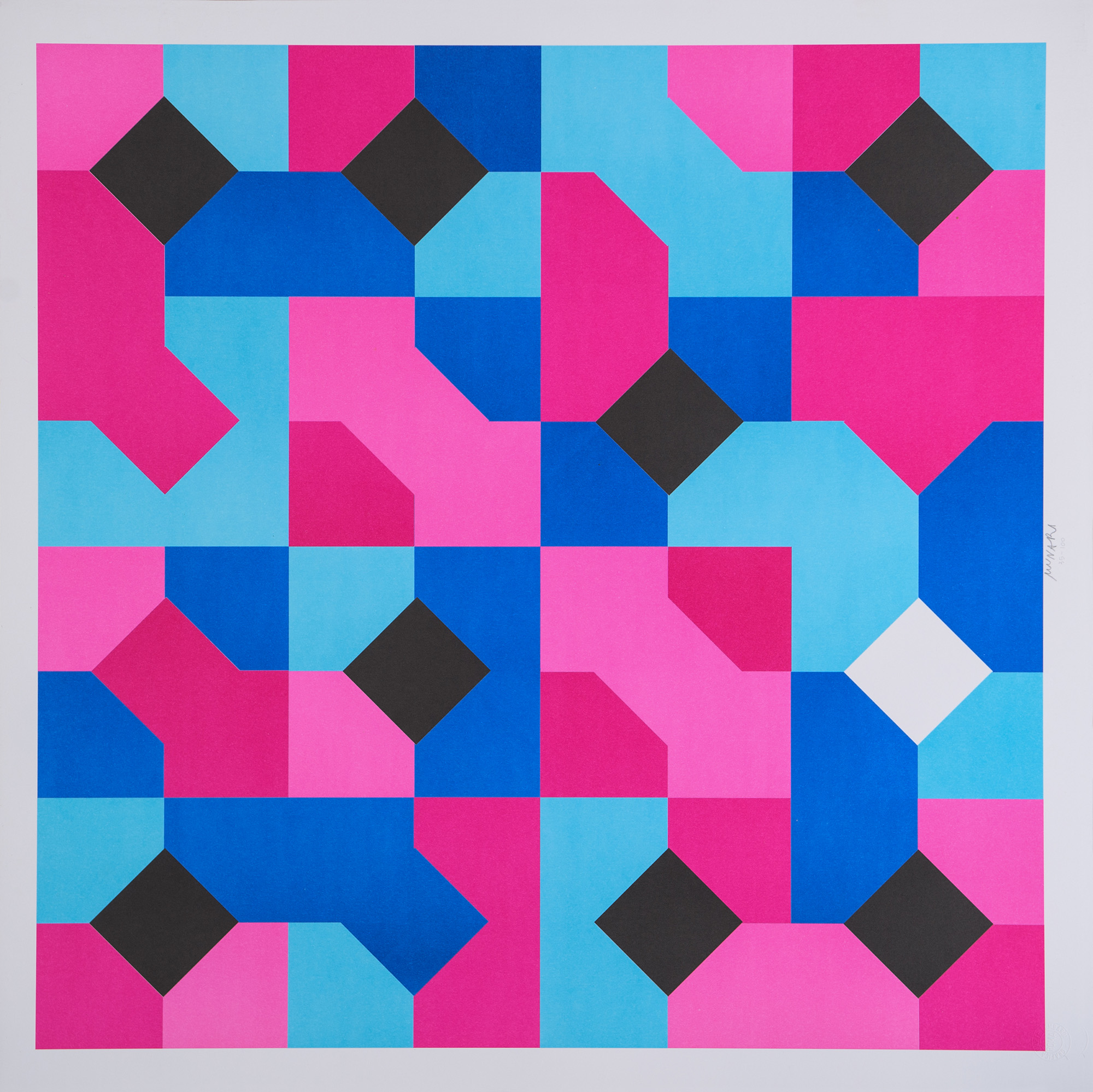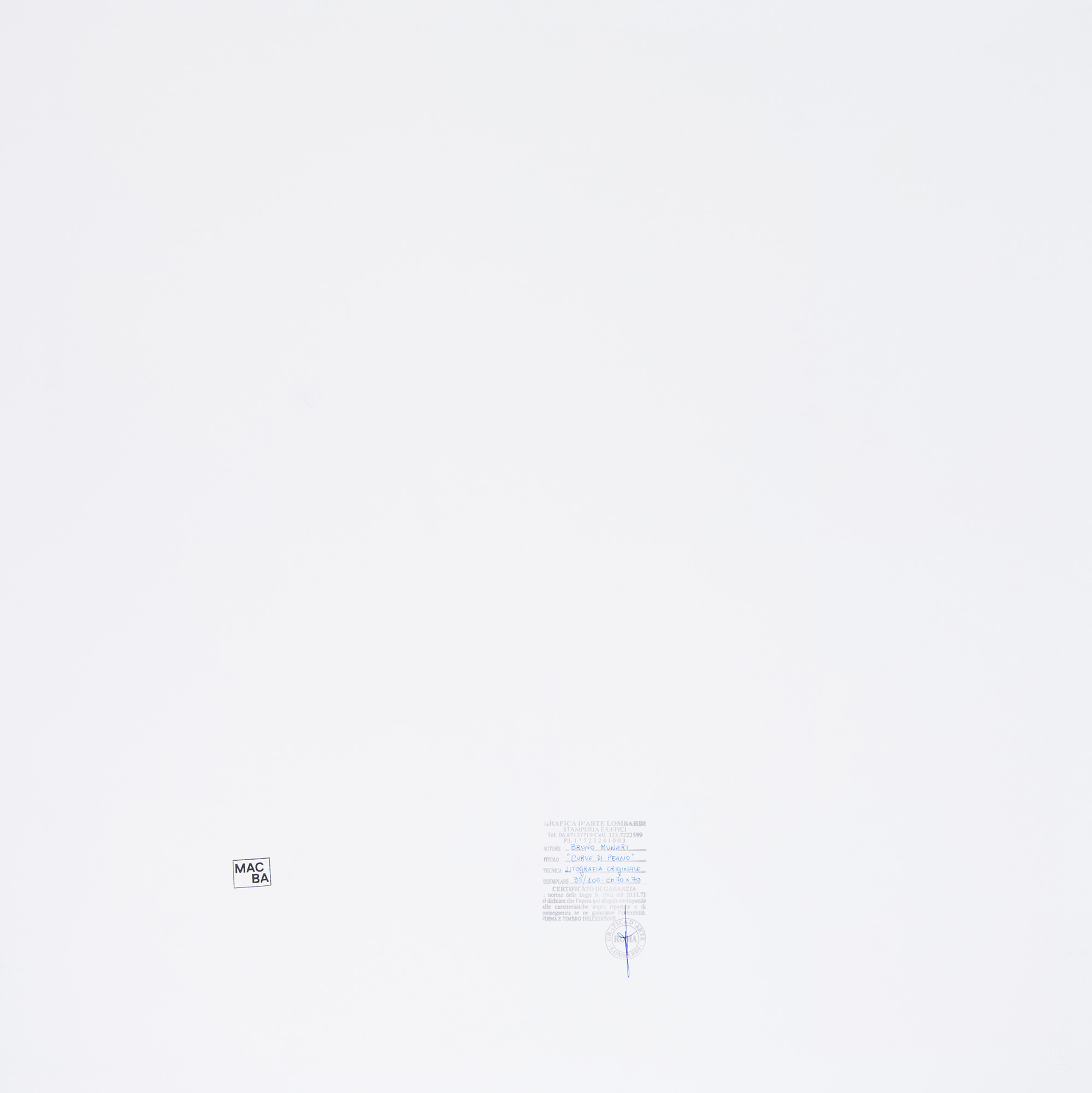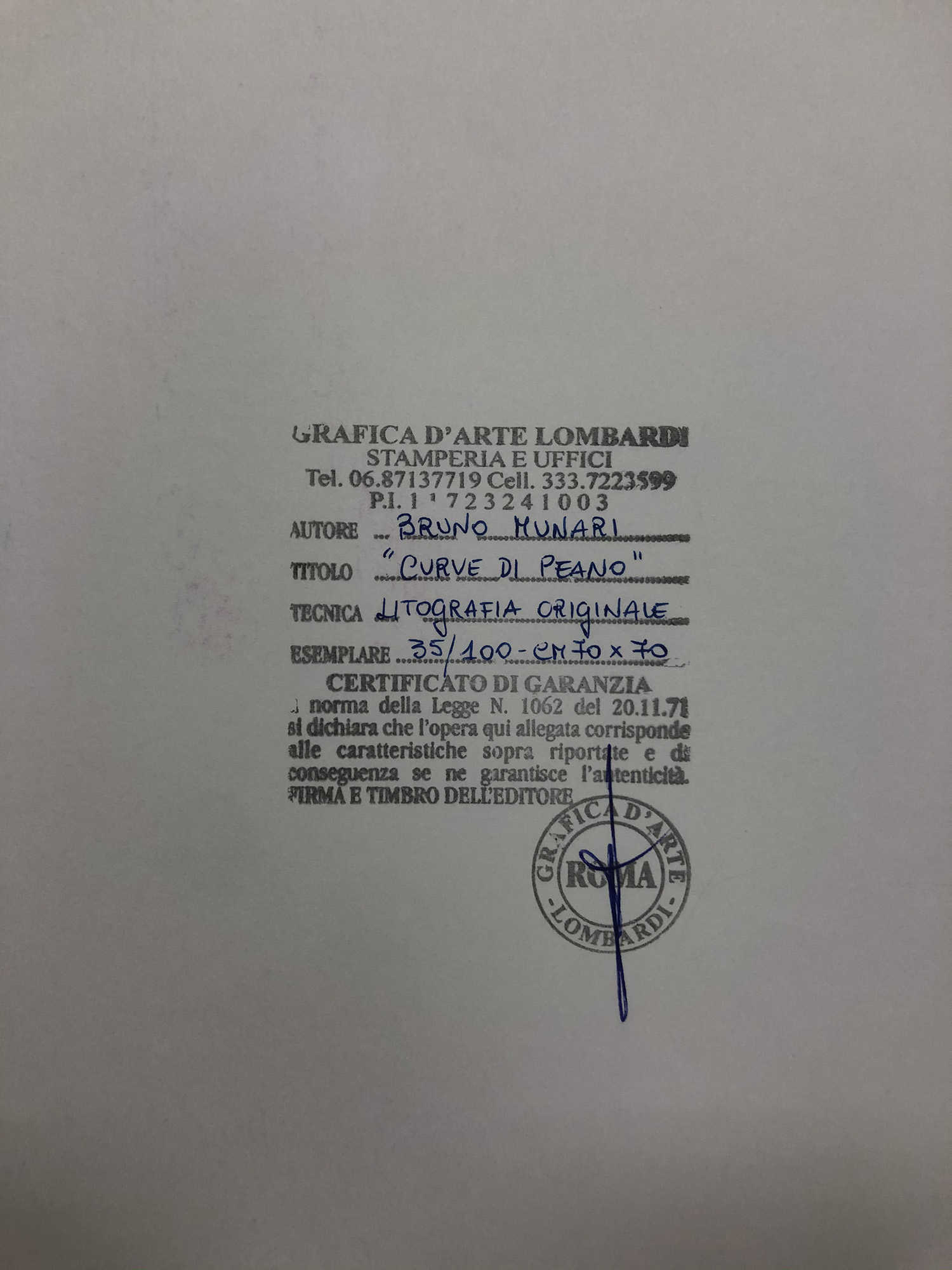 Bruno Munari "Curve di Peano". Lithograph on museum cardboard. Year: 1993. Size: cm 70 x 70 - in 27,6 x 27,6. Edition of 100 copies + XXX. Copy n. 35/100. Edition for the Museo de Arte Contemporàneo - Barcelona. Hand signed and numbered lower center: "MUNARI 35 - 100". Dry stamp of the printer "Grafiche d'Arte Lombardi" lower left. Certificate of guarantee and "Grafiche d'Arte Lombardi" stamp on the back. Provenance: Private Collection, Asti (Italy)