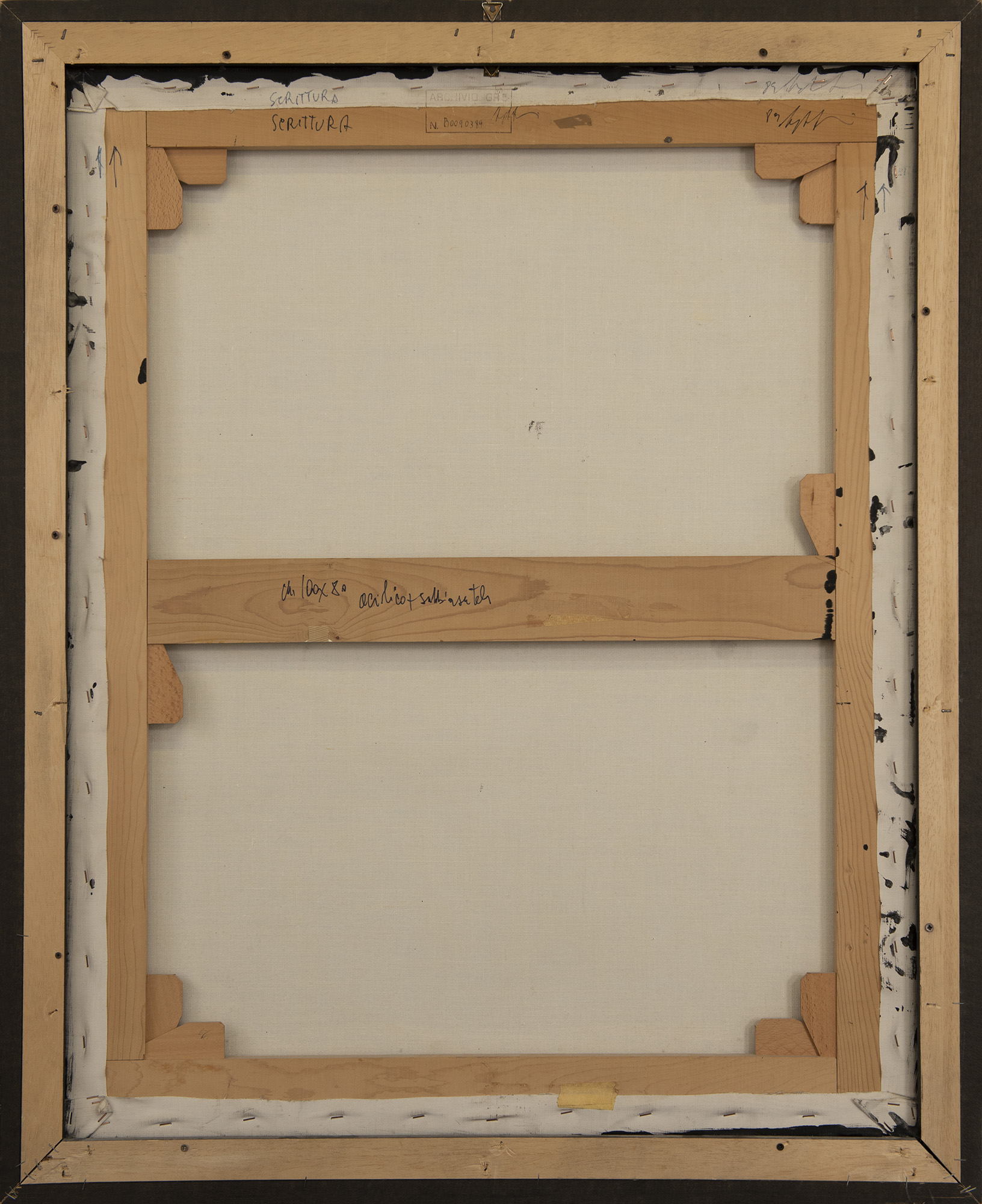 Agostino Ferrari "Scrittura". Year: 1989. Technique: Acrylic and sand on canvas. Size: cm 100 x 80 - in 39,4 x 31,5. Framed with black frame without glass. Accompanied by a certificate of authenticity issued by Agostino Ferrari Archive on photography. Published in the Agostino Ferrari General Catalog Electa Edition pag. 360. Provenance: Private Collection: Italy