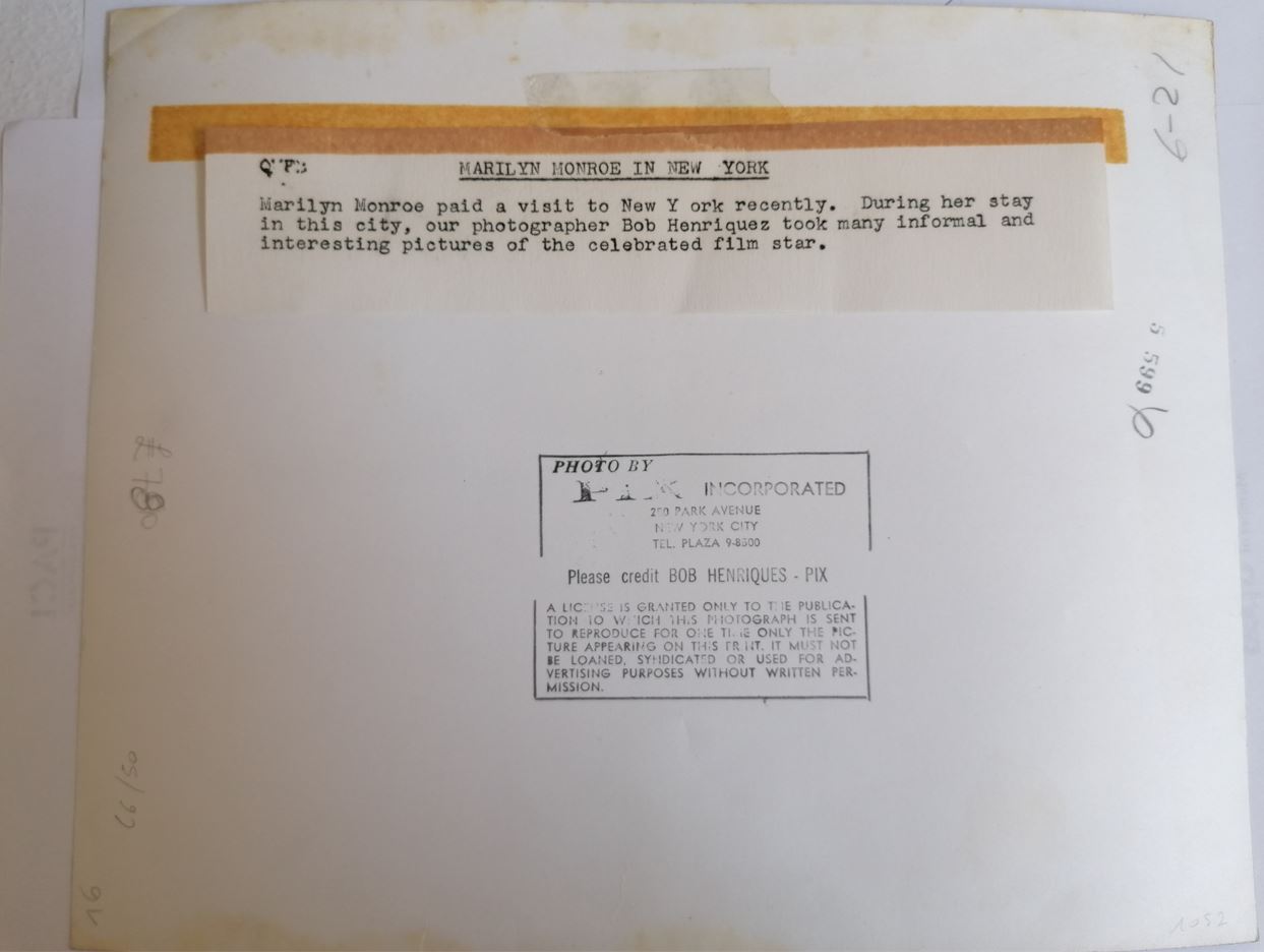 Bob Henriques "Marilyn Monroe". Year 1958. Gelatin silver print. Size cm 20.5 x 25.5 ca. Bob Henriques stamp on the back. Provenance: Bob Henriques Studio; Private Collection (France); Private Collection, Brescia (Italy). Publication: "Moda & Cinema" curated by Paci contemporary gallery, 2016