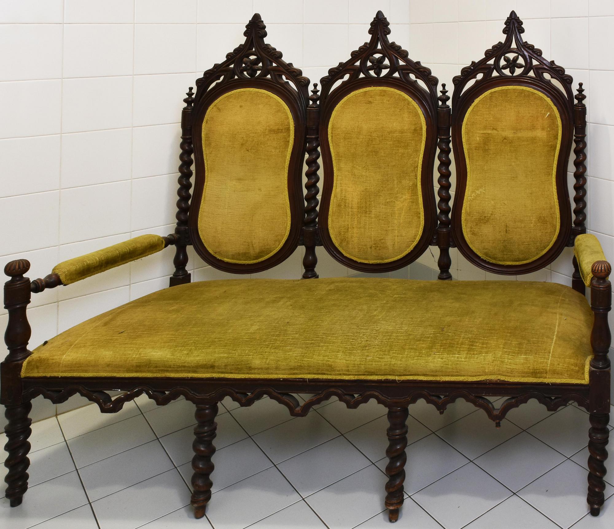 Lotto 199 | DIVANO a 3 posti in noce finemente scolpito a motivi di gusto neogotico con...