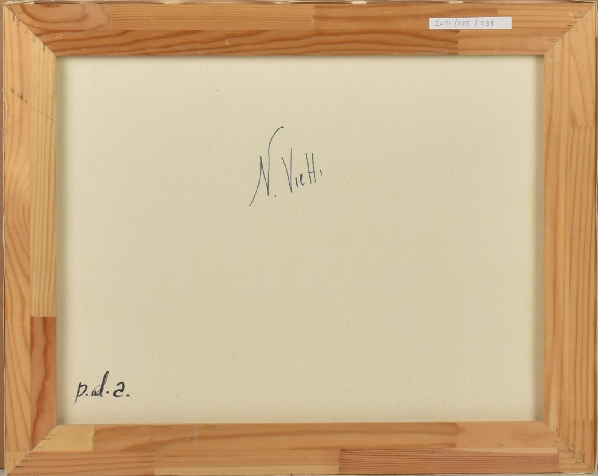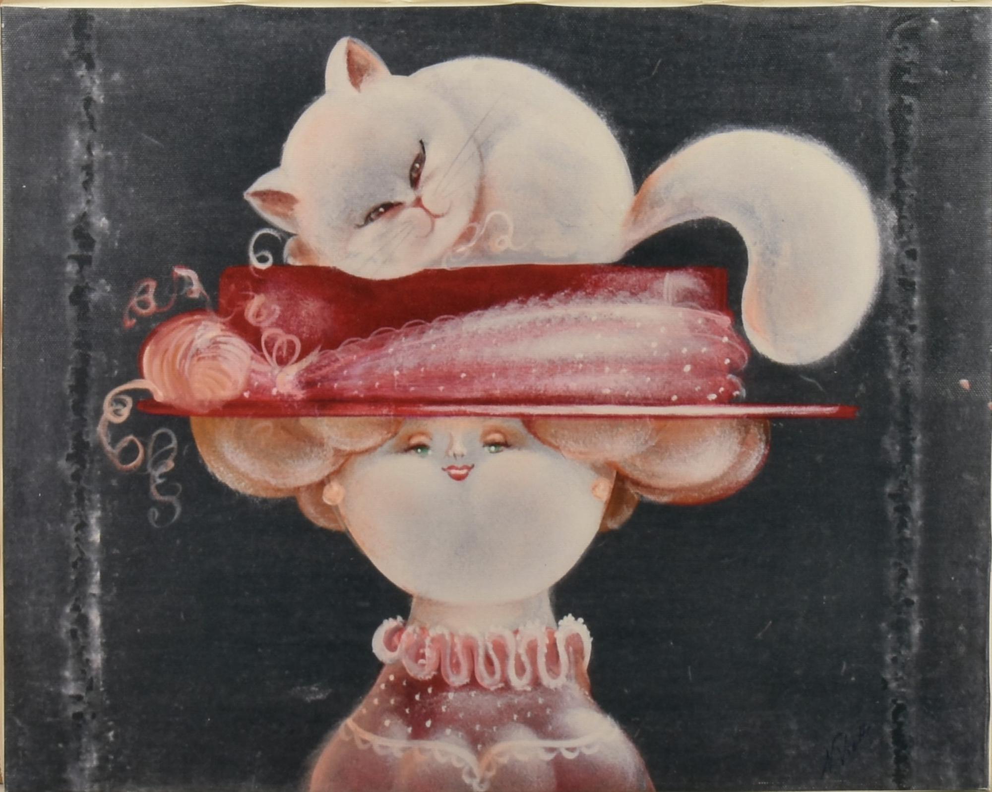 Nicola Vietti FIGURA FEMMINILE E GATTO emulsione su tela, cm 40x50; P.D.A....