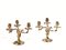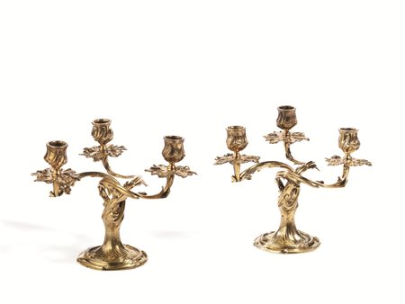 Coppia di candelabri, Copenaghen, metà sec. XX, in argento dorato, a tre bracci ciscuno a volute di foglie, basi circolari, alt. cm 19, g 2620 (2)